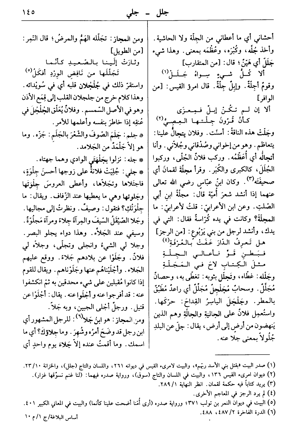 وجلت هذه الناقة: أسنت. وفلان يتجال علينا: يتعاظم. وهو من إخواني وصدقاني وجلاني. وأنا أتجاله أي أعظمه. وركب فلان الجلّى، وركبوا الجلل، كالكبرى والكبر. وقرأ مجلة لقمان أي صحيفته. وكان ابن عباس رضي الله تعالى عنهما إذا أنشد شعر أمية قال: مجلة ابن أبي الصلت. وعن ابن الأعرابي: قلت لأعرابي: ما المجلة وكانت في يده كراسة فقال: التي في يدك، وأنشد لرجل من بني يربوع: