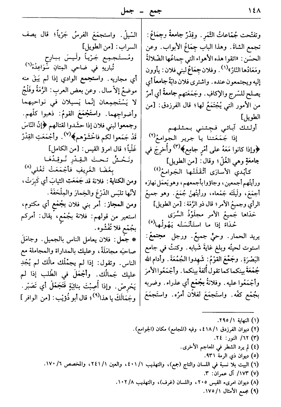 يريد الحمار. وحي جميع. ورجل مجتمع: استوت لحيته وبلغ غاية شبابه. وكنت في جامع البصرة. وجمع القوم شهدوا الجمعة. وأدام الله جمعة بينكما كما تقول ألفة بينكما. وأجمعوا الأمر وأجمعوا عليه. وفلانة بجمعٍ أي عذراء. وضربه بجمع كفه. واستجمع لفلان أمره. واستجمع السيل. واستجمع الفرس جرياً. قال يصف السراب: