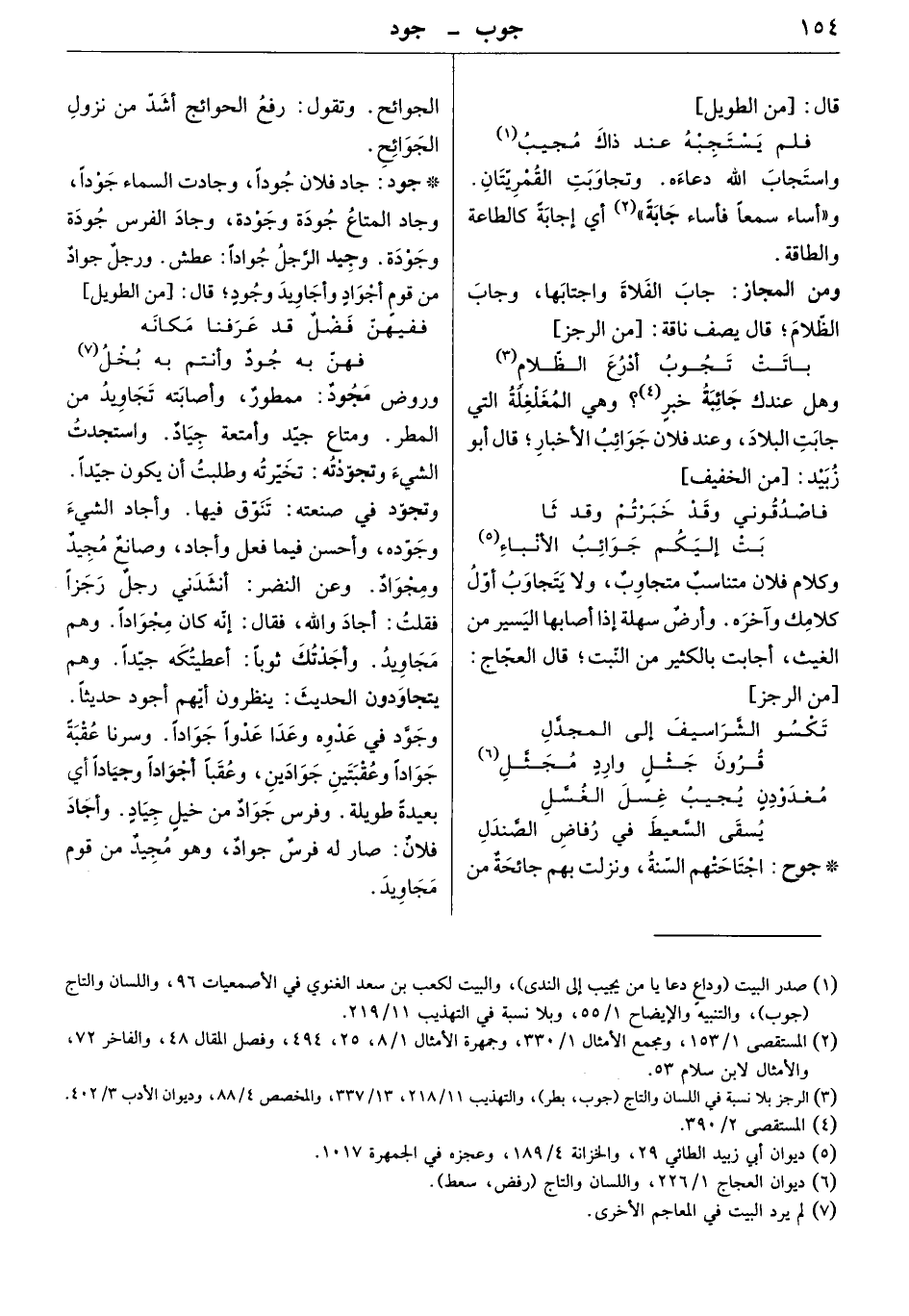 وروض مجود: ممطور، وأصابته تجاويد من المطر. ومتاع جيد وأمتعة جياد. واستجدت الشيء وتجودته: تخيرته وطلبت أن يكون جيداً. وتجود في صنعته: تنوق فيها. وأجاد الشيء وجوده، وأحسن فيما فعل وأجاد، وصانع مجيد ومجواد. وعن النضر: أنشدني رجل رجزاً فقلت: أجاد والله، فقال: إنه كان مجواداً. وهم مجاويد. وأجدتك ثوباً: أعطيتكه جيداً. وهم يتجاودون الحديث: ينظرون أيهم أجود حديثاً. وجود في عدوه وعدا عدواً جواداً. وسرنا عقبة جواداً وعقبتين جوادين، وعقباً أجواداً وجياداً أي بعيدة طويلة. وفرس جواد من خيل جياد. وأجاد فلان: صار له فرس جواد، وهو مجيد من قوم مجاويد.