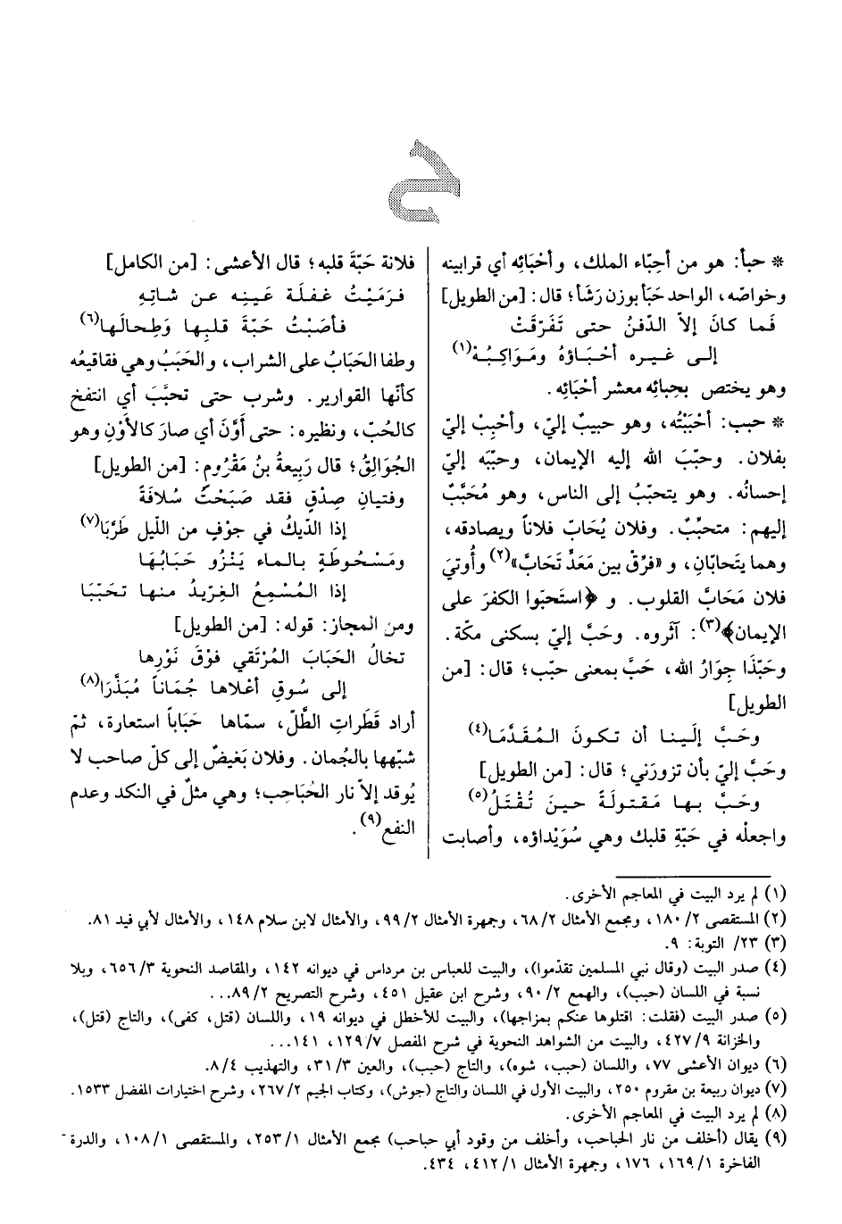 أحببته، وهو حبيب إليّ، وأحبب إليّ بفلان. وحبب الله إليه الإيمان، وحببه إليّ إحسانه. وهو يتحبب إلى الناس، وهو محبب إليهم: متحبب. وفلان يحاب فلاناً ويصادقه، وهما يتحابان، وفرق بين معد تحاب. وأوتي فلان محاب القلوب. واستحبوا الكفر على الإيمان: آثروه. وحب إليّ بسكنى مكة، وحبذا جوار الله، حب بمعنى حبب. قال:
