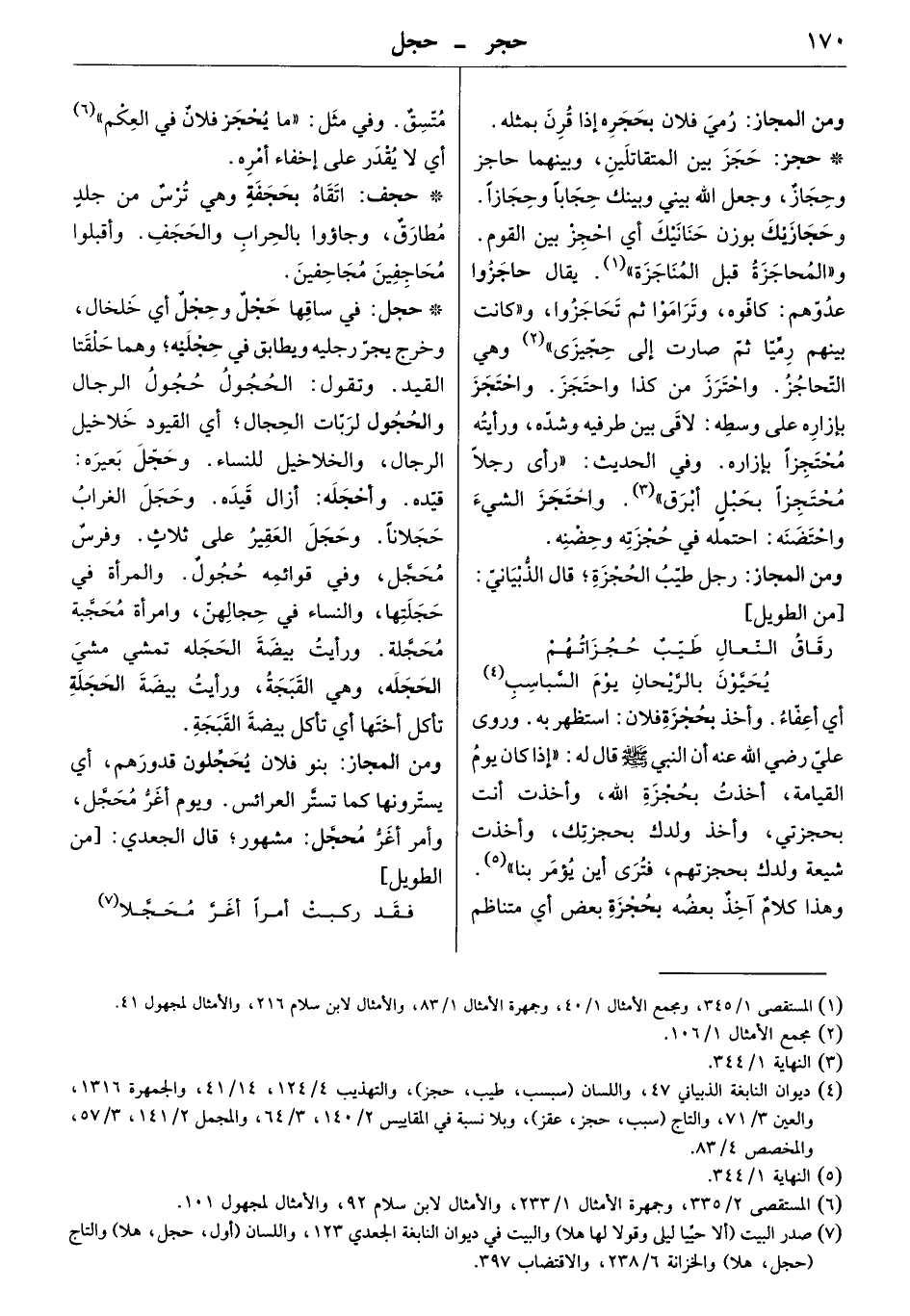 ومن المجاز: بنو فلان يحجلون قدورهم، أي يسترونها كما تستر العرائس. ويوم أغر محجل، وأمر أغر محجل: مشهور. قال الجعدي: