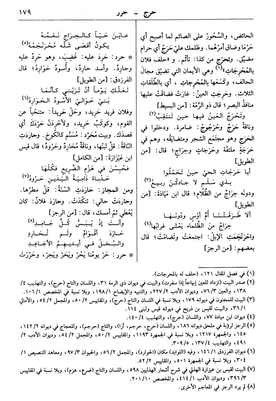 الحائض، والسحور على الصائم لما أصبح أي حرماً وضاق أمرهما. وظلمك عليّ حرج أي حرام مضيقز وتحرج من كذا: تأثم. وحلف فلان بالمحرجات وهي الأيمان التي تضيق مجال الحلاف، وكسعها بالمحرجات، أي بالطلقات الثلاث وحرجت العين: غارت فضاقت عليها منافذ البصر. قال ذو الرمة: