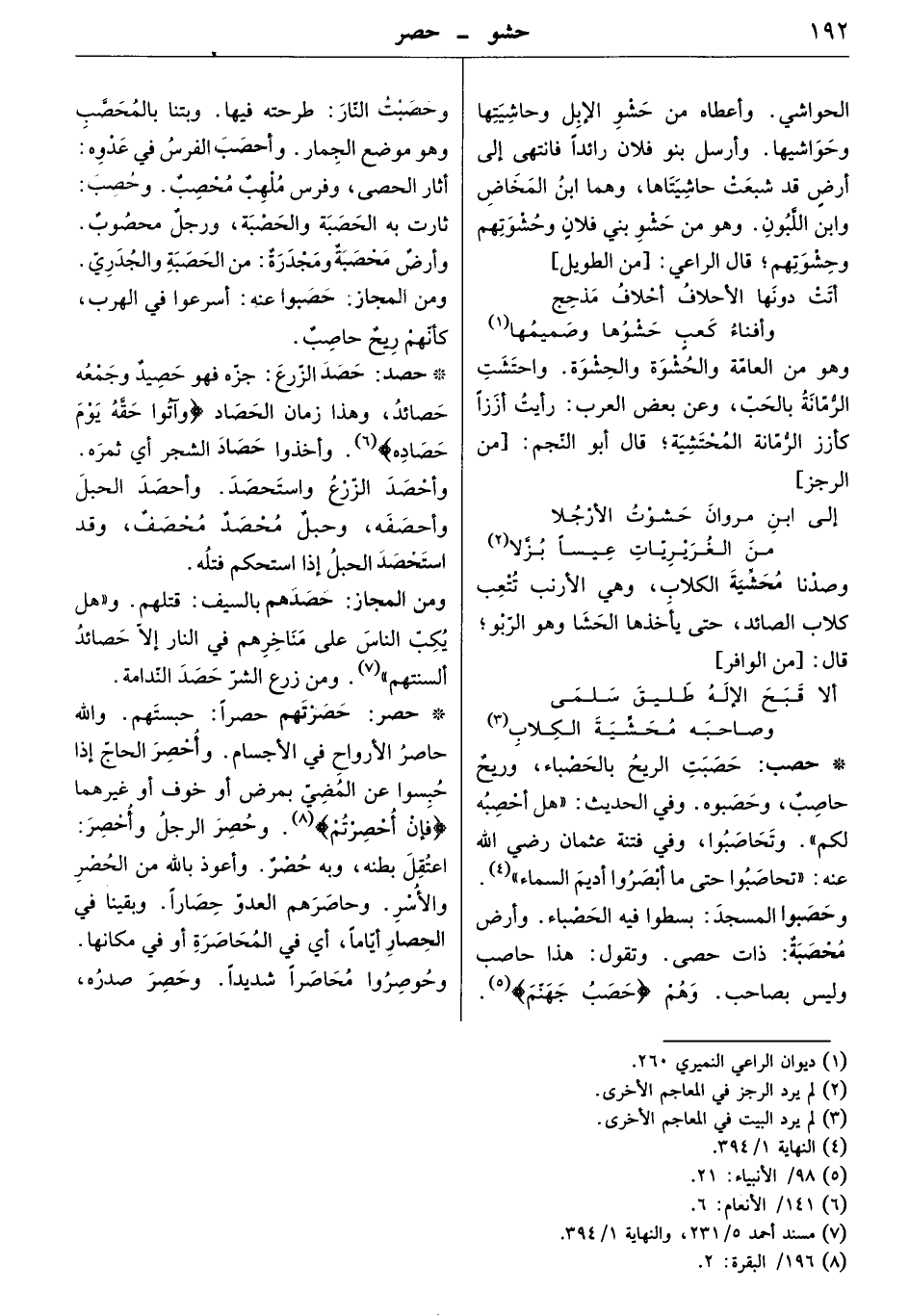 حصرتهم حصراً: حبستهم. والله حاصر الأرواح في الأجسام. وأحصر الحاج إذا حبسوا عن المضيّ بمرض أو خوف أو غيرهما " فإن أحصرتم ". وحصر الرجل وأحصر: اعتقل بطنه، وبه حصر. وأعوذ بالله من الحصر والأسر. وحاصرهم العدو حصاراً. وبقينا في الحصار أياماً، أي في المحاصرة أو في مكانها. وحوصروا محاصراً شديداً. وحصر صدره،