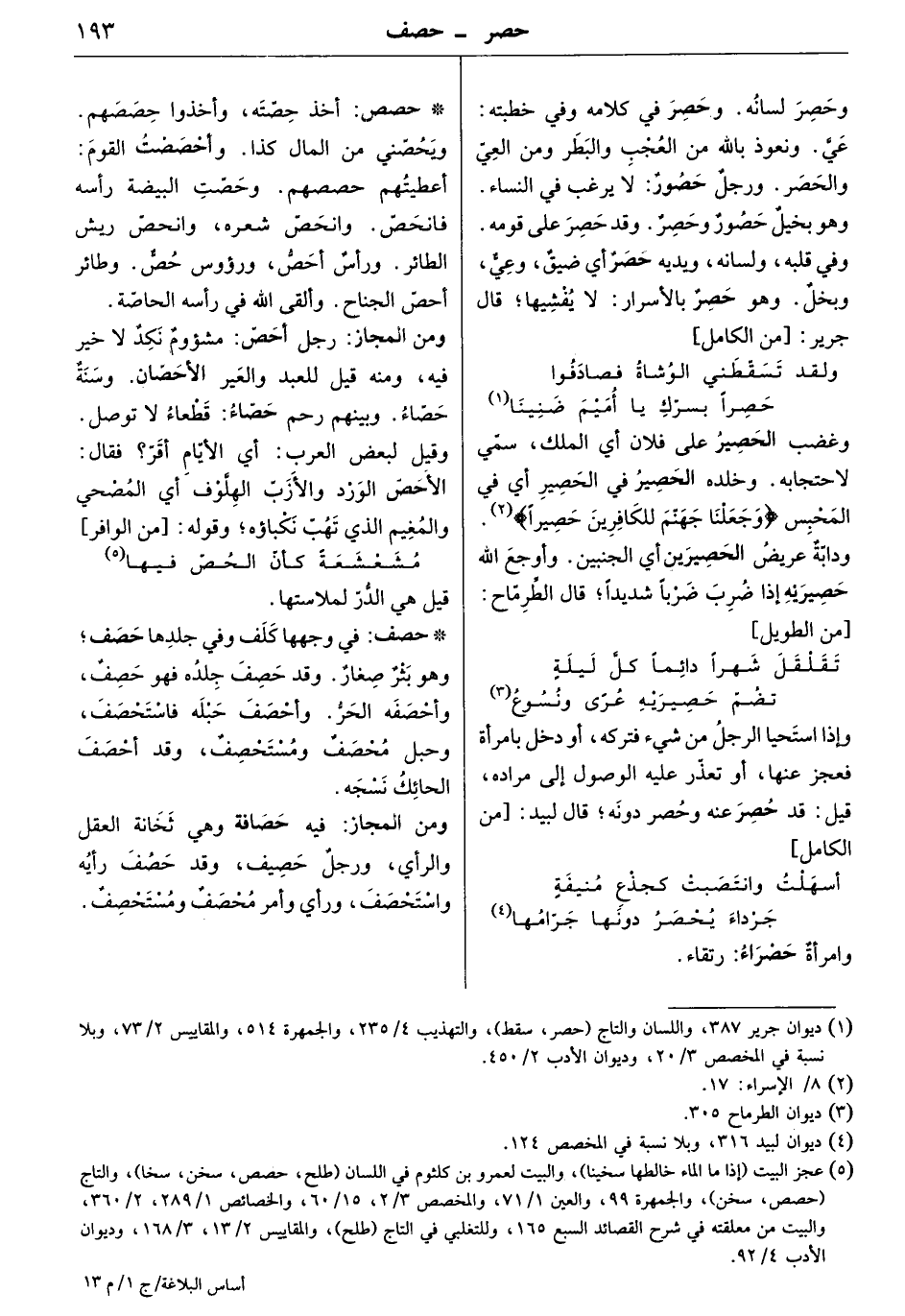 وحصر لسانه. وحصر في كلامه وفي خطبته: عيّ. ونعوذ بالله من العجب والبطر، ومن العيّ والحصر. ورجل حصور: لا يرغب في النساء. وهو بخيل حصور وحصر. وقد حصر على قومه. وفي قلبه، ولسانه، ويديه حصر أي ضيق، وعيٌّ، وبخل. وهو حصر بالأسرار: لا يفشيها. قال جرير: