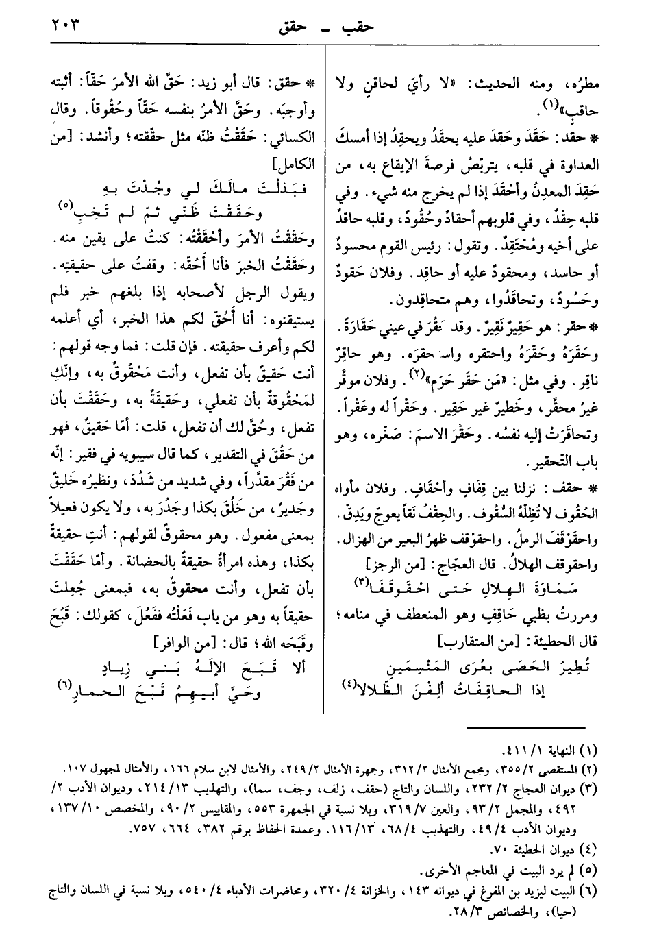 وحققت الأمر وأحققته: كنت على يقين منه. وحققت الخبر فأنا أحقه: وقفت على حقيقته. ويقول الرجل لأصحابه إذا بلغهم خبر فلم يستيقنوه: أنا أحق لكم هذا الخبر، أي أعلمه لكم وأعرف حقيقته. فإن قلت: فما وجه قولهم: أنت حقيق بأن تفعل، وأنت محقوق به، وإنك لمحقوقة بأن تفعلي، وحقيقة به، وحققت بأن تفعل، وحق لك أن تفعل، قلت: أما حقيق، فهو من حقق في التقدير، كما قال سيبويه في فقير: إنّه من فقر مقدراً، وفي شديد من شدد، ونظره خليق وجدير، من خلق بكذا وجذر به، ولا يكون فعيلاً بمعنى مفعول. وهو محقوق لقولهم: أنت حقيقة بكذا، وهذه امرأة حقيقة بالحضانة. وأما حققت بأن تفعل، وأنت محقوق به، فبمعنى جعلت حقيقاً به وهو من باب فعلته ففعل، كقولك: قبح وقبحه الله. قال: