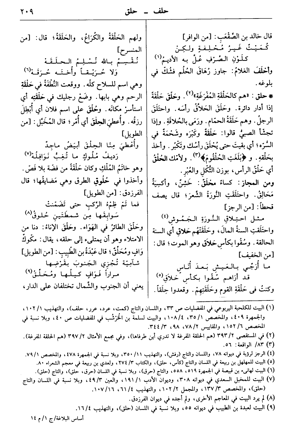 " هم كالحلقة المفرغة " وحلق حلقة إذا أدار دائرة. وحلق الحلاق رأسه. واحتلق الرجل. وهم حلقة الحمام. ورمى بالحلاقة. وإذا تجشأ الصبي قالوا: حلقة وكبره، وشحمة في السره؛ أي بقيت حتى يحلق رأسك وتكبر. وأخذ بحلقه. و" بلغت الحلقوم " ولأمك الحلق أي حلق الرأس، بوزن الثكل والعبر.