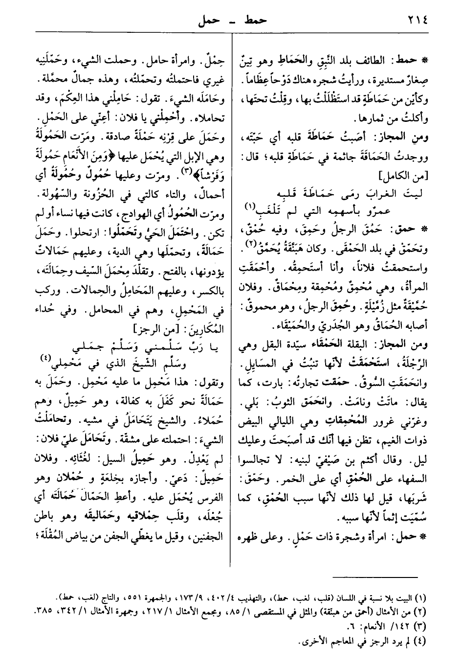 امرأة وشجرة ذات حمل. وعلى ظهره حمل. وامرأة حامل. وحملت الشيء، وحملنيه غيري فاحتملته وتحملته، وهذه حمال محملة. وحامله الشيء. تقول: حاملني هذا العكم، وقد تحاملاه. وأحملني يا فلان: أعني على الحمل. وحمل على قرنه حملة صادقة. ومرت الحمولة وهي الإبل التي يحمل عليها " ومن الأنعام حمولة وفرشاً ". ومرت وعليها حمول وحمولة أي أحمال، والتاء كالتي في الحزونة والسهولة. ومرت الحمول أي الهوادج، كانت فيها نساء أو لم تكن. واحتمل الحي وتحملوا: ارتحلوا. وحمل حمالة، وتحملها وهي الدية، وعليهم حمالات يؤدونها بالفتح. وتقلد يحمل السيف وحمالته بالكسر، وعليهم المحامل والحمالات. وركب في المحمل، وهم في المحامل. وفي حداء المكارين: