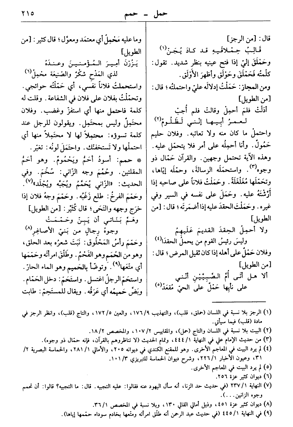 واحتمل ما كان منه ولا تعاتبه. وفلان حليم حمول. وأنا أحمله على أمر فلا يتهحمل عليه. وهذه الآية تحتمل وجهين. والقرآن حمال ذو وجوه. واستحمله الرسالة، وحمله إياها، وتحملها مغلغلة. وحملت فلاناً على صاحبه إذا أرشته عليه. وحمل على نفسه في السير وفي غيره. وحملت الحقد عليه إذا أضمرته. قال: