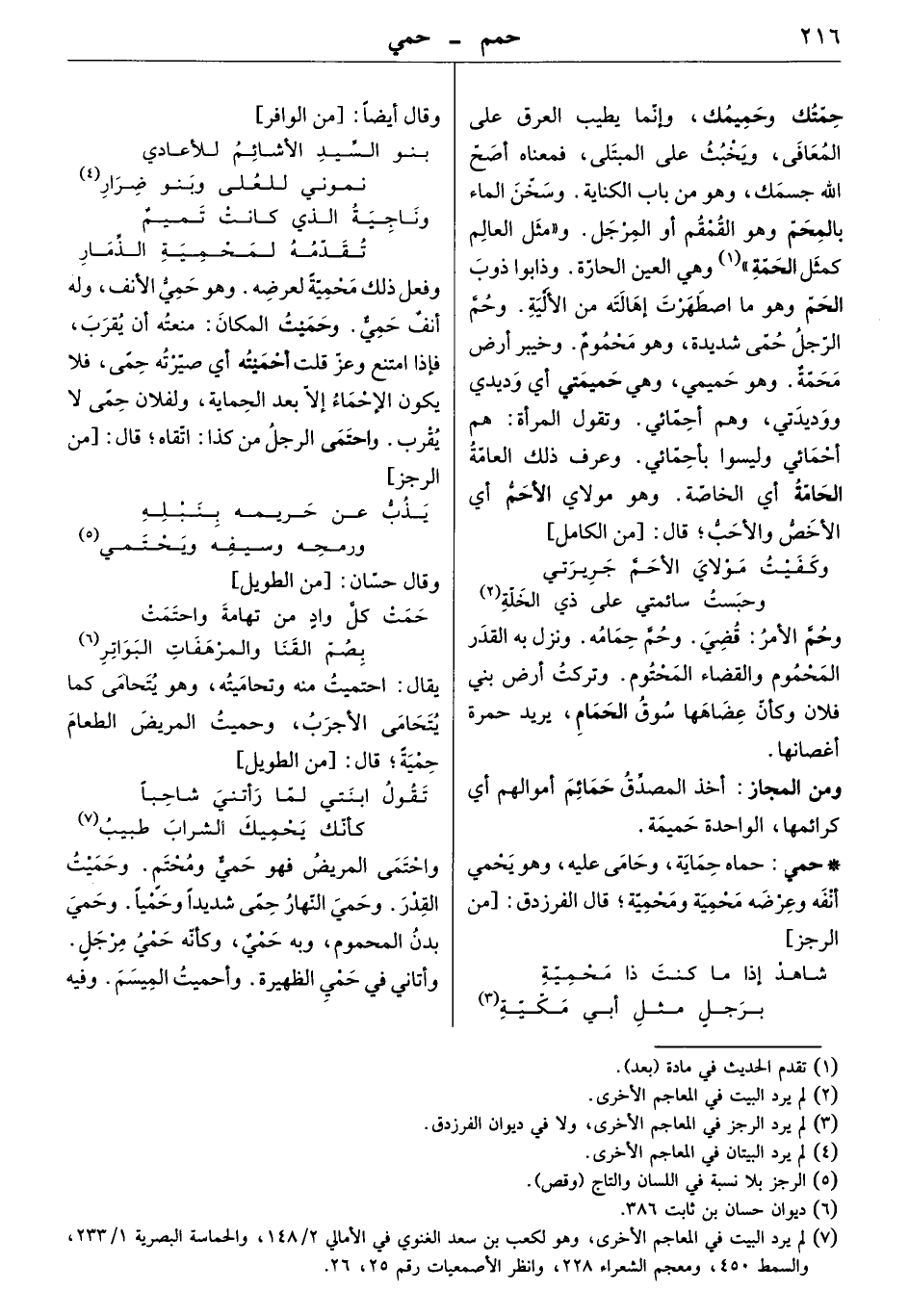 حمتك وحميمك، وإنما يطيب العرق على المعافى، ويخبث على المبتلى، فمعناه أصح الله جسمك، وهو من باب الكناية. وسخن الماء بالمحم وهو القمقم أو المرجل. " ومثل العالم كمثل الحمة " وهي العين الحارة. وذابوا ذوب الحم وهو ما اصطهرت إهالته من الألية. وحم الرجل حمّى شديدة، وهو محموم. وخيبر أرض محمة. وهو حميمي، وهي حميمتي أي وديدي ووديدتي، وهم أحمائي. وتقول المرأة: هم أحمائي وليسوا بأحمائي. وعرف ذ العامة والحامة أي الخاصة. وهو مولاي الأحم أي الأخص والأحب. قال: