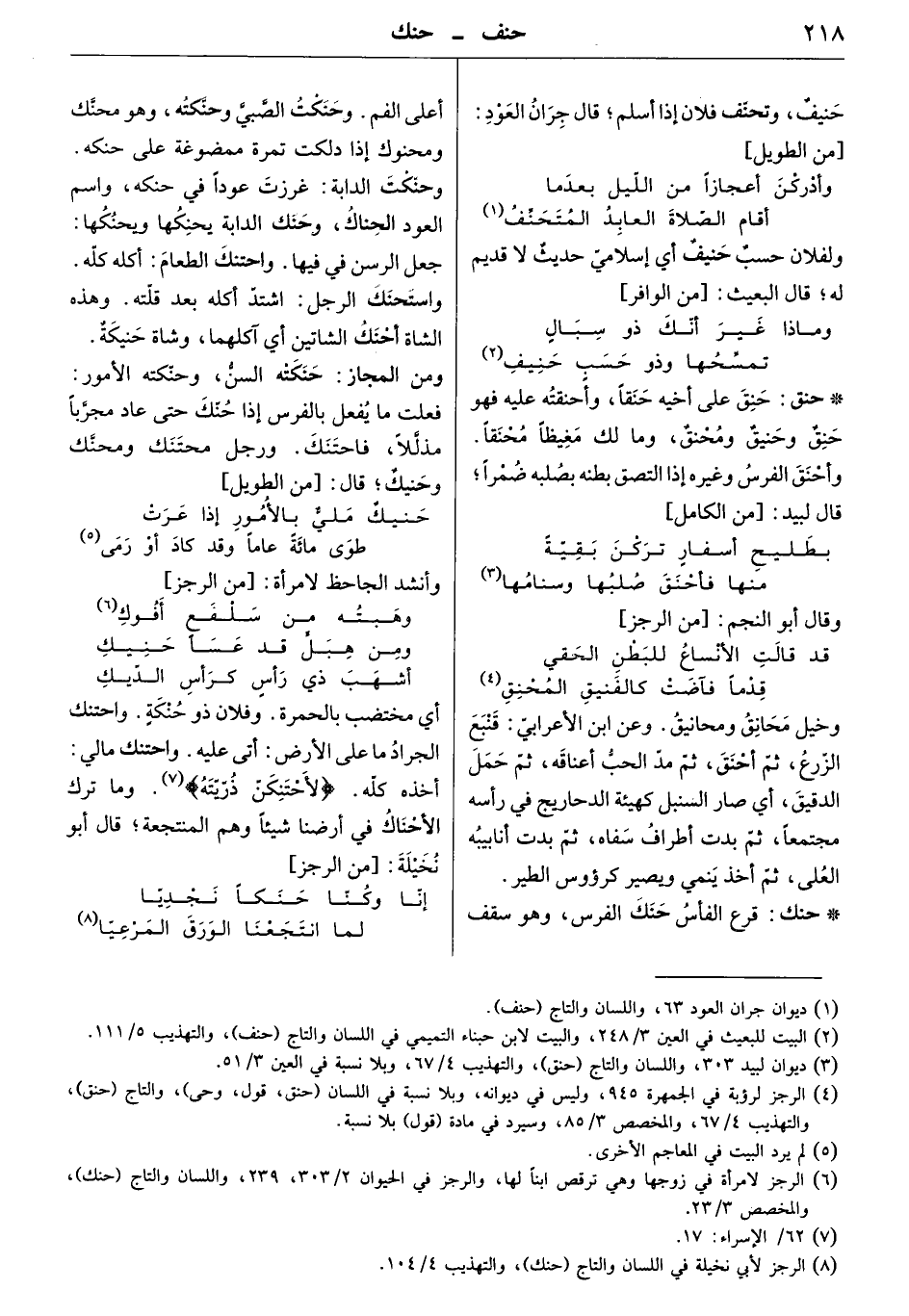 قرع الفأس حنك الفرس، وهو سقف أعلى الفم. وحنكت الصبي وحنكته، وهو محنك ومحنوك إذا دلكت تمرة ممضوغة على حنكه. وحنكت الدابة: غرزت عوداً في حنكه، واسم العودج الحناك، وحنك الدابة يحنكها: جعل الرسن في فيها. واحتنك الطعام: أكله كله. واستحنك الرجل: اشتد أكله بعد قلته. وهذه الشاة أحنك الشاتين أي آكلهما، وشاة حنيكة.