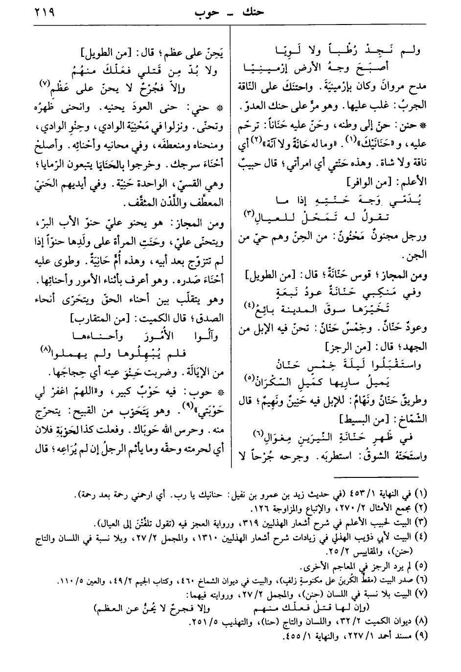 حن إلى وطنه، وحن عليه حناناً: ترحم عليه، وحنانيك. وماله حانة ولا آنة أي ناقة ولا شاة. وهذه حنتي أي امرأتي. قال حبيب الأعلم: