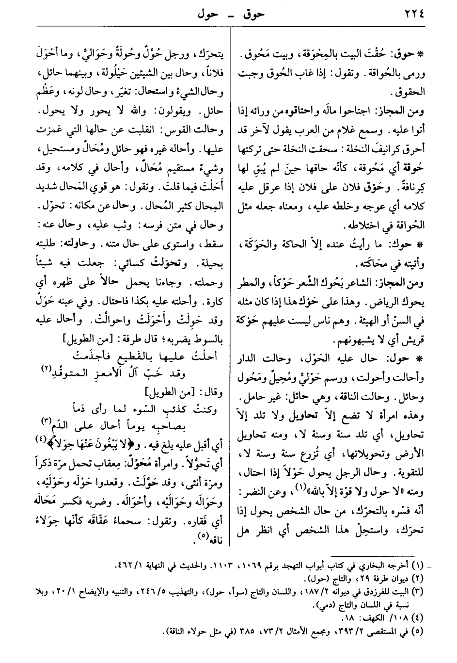 أي أقبل عليه يلغ فيه " لا يبغون عنها حولاً " أي تحولا. وامرأة محول: معقاب تحمل مرة ذكراً ومرة أنثى، وقد حولت. وقعدوا حوله وحوليه، وحواله وحواليه، وأحواله. وضربه فكسر محاله أي فقاره. وتقول: سحماء عقاقه، كأنها حولاء ناقة.