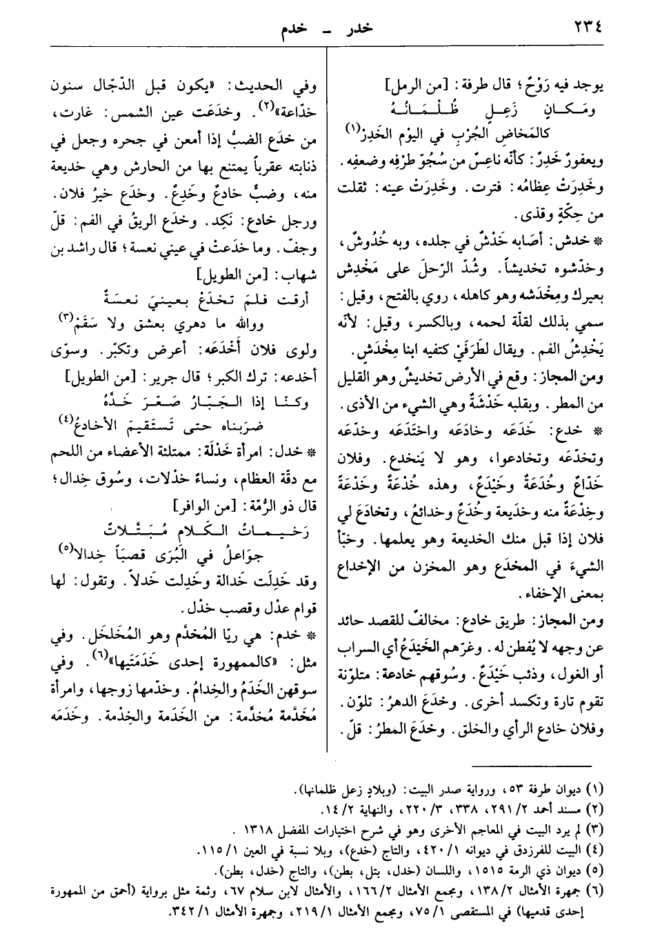 ومن المجاز: طريق خادع: مخالف المقصد حائد عن وجهه لا يفطن له. وغرهم الخيدع أي السراب أو الغول، وذئب خيدع. وسوقهم خادعة: متلونة تقوم تارة وتكسد أخرى. وخدع الدهر: تلون. وفلان خادع الرأي والخلق. وخدع المطر: قل. وفي الحديث " يكون قبل الدجال سنون خداعة " وخدعت عين الشمس: غارت من خدع الضب إذا أمعن في جحره وجعل في ذنابته عقرباً يمتنع بها من الحارش وهي خديعة منه، وضب خادع وخدع. وخدع خير فلان. ورجل خادع: نكد. وخدع الريق في الفم: قل وجف.