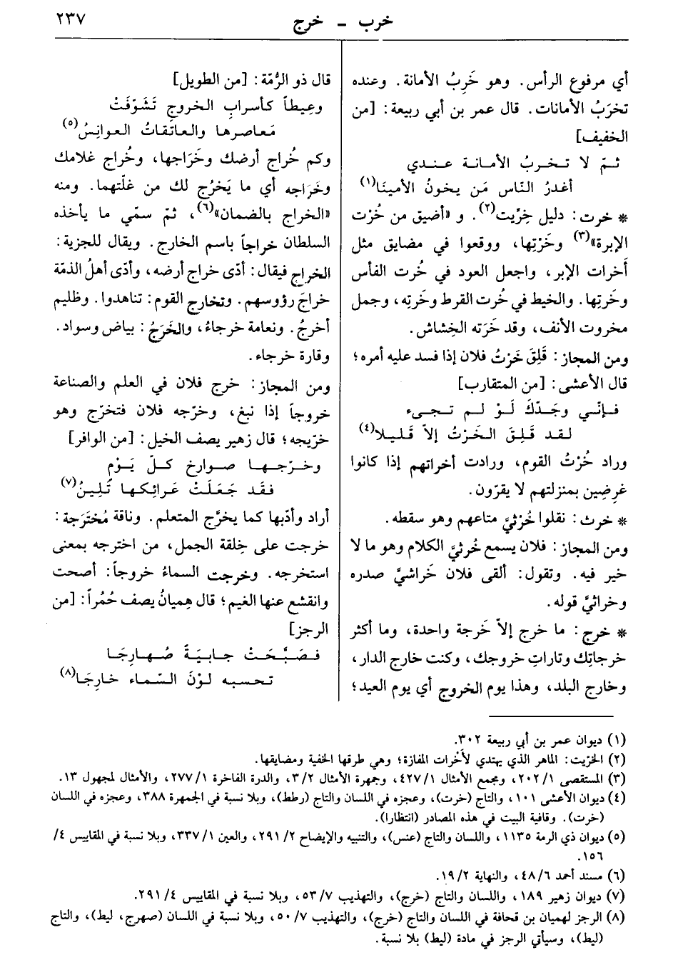 ما خرج إلا خرجة واحدة، وما أكثر خرجاتك، وتارات خروجك، وكنت خارج الدار، وخارج البلد، وهذا يوم الخروج أي يوم العيد. قال ذو الرمة: