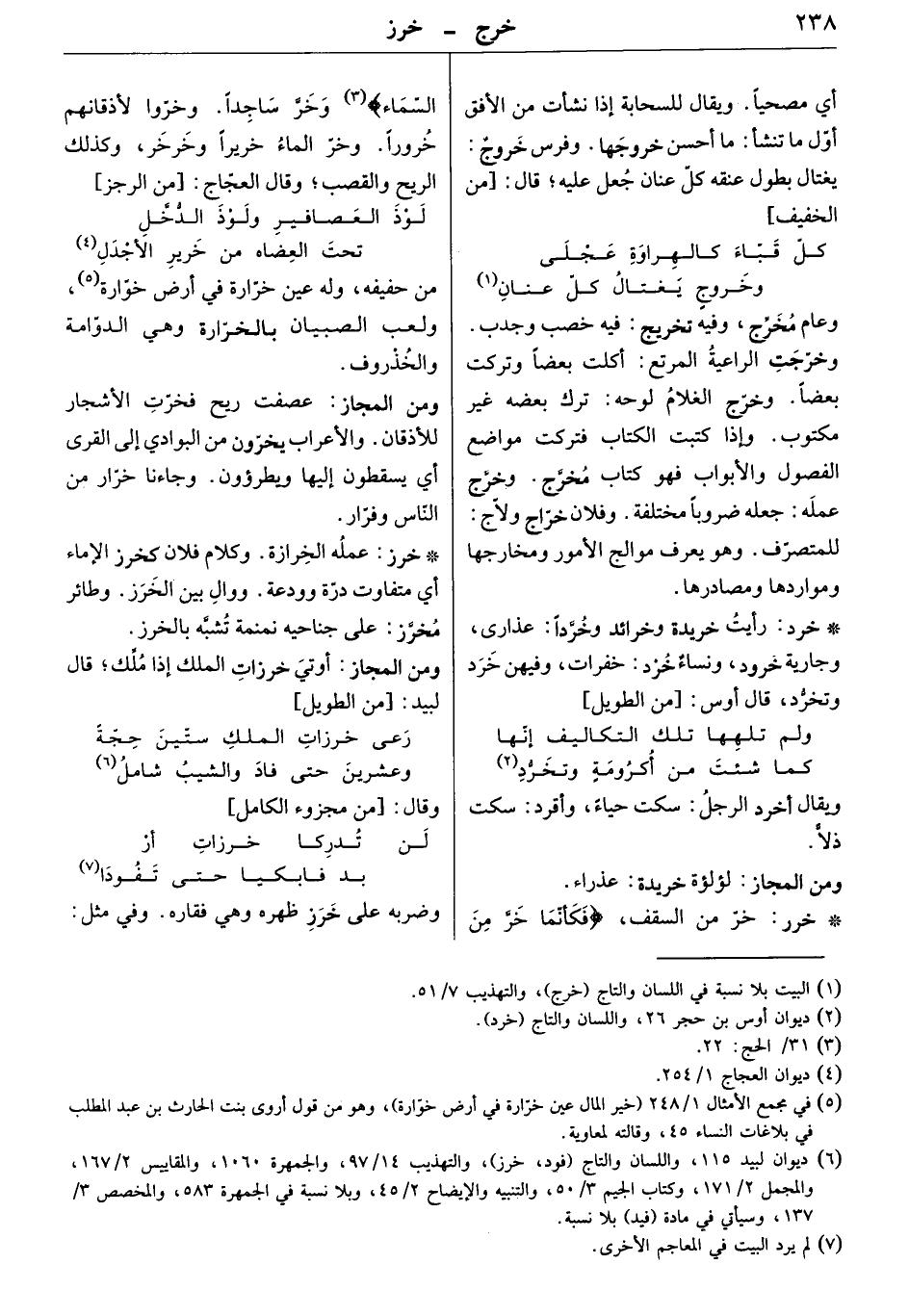 خرّ من السقف، " فكأنما خرّ من السماء " " وخرّ ساجداً " وخروا لأذقاهم خروراً. وخر الماء خريراً وخرخر، وكذلك الريح والقصب. وقال العجاج: