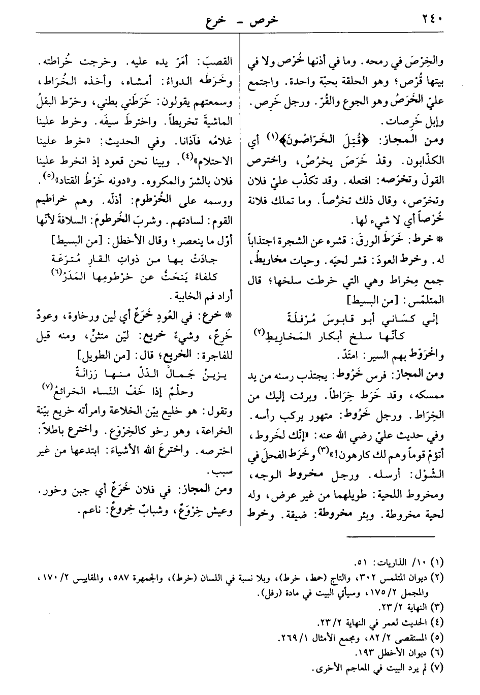 ومن المجاز: " قتل الخراصون " أي الكذابون. وقد خرص يخرص، واخترص القول وتخرصه: افتعله. وقد تكذّب عليّ فلان وتخرّص، وقال ذلك تخرصاً. وما تملك فلانة خرصاً اي لا شيء لها.
