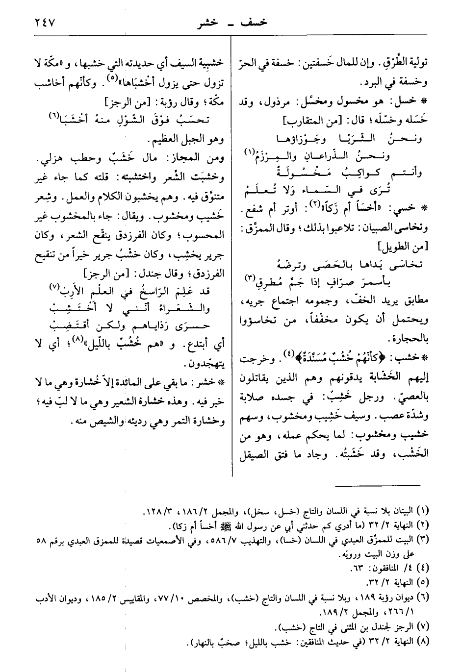 " كأنهم خشب مسندة "، وخرجت إليهم الخشابة يدقونهم وهم الذين يقاتلون بالعصيّ. ورجل خشب: في جسده صلابة وشدة عصب. وسيف خشيب ومخشوب، وسهم خشيب ومخشوب: لما يحكم عمله. وهو من الخشب. وقد خشبته. وجاد ما فتق الصيقل خشيبة السيف أي حديدته التي خشبها و" مكة لا تزول حتى يزول أخشباها " وكأنهم أخاشب مكة. وقال رؤبة: