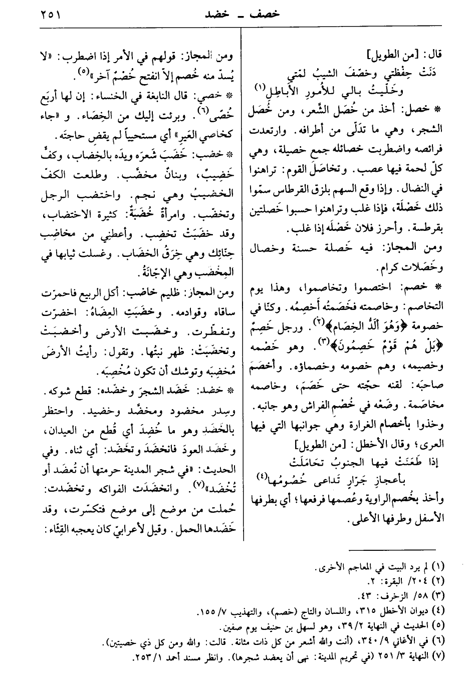 اختصموا وتخاصموا، وهذا يوم التخاصم. وخاصمته فخصمته أخصمه. وكنا في خصومة " وهو ألد الخصام " ورجل خصم " بل هم قوم خصمون " وهو خصمه وخصيمه، وهم خصومه وخصماؤه. وأخصم صاحبه: لقنه حجته حتى خصم، وخاصمه مخاصمة. وضعه في خصم الفراش وهو جانبه. وخذوا بأخصام الغرارة وهي جوانبها التي فيها العرى. وقال الأخطل: