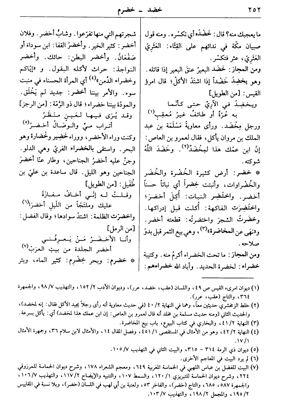 ومن المجاز: ما تحت الخضراء أكرم منه. وكتيبة خضراء لخضرة الحديد. وأباد الله خضراءهم: شجرتهم التي منها تفرعوا. وشاب أخضر. وفلان أخضر: كثير الخير. وأخضر القفا: ابن سوداء أو صفعان. وأخضر البطن: حائك. وأخضر النواجذ: حراث لأكله البقول. " وإياكم وخضراء الدّمن " أي المرأة الحسناء في منبت سوء. والأمر بيننا أخضر: جديد لم يخلق. والودة بيننا خضراء. قال ذو الرمة: