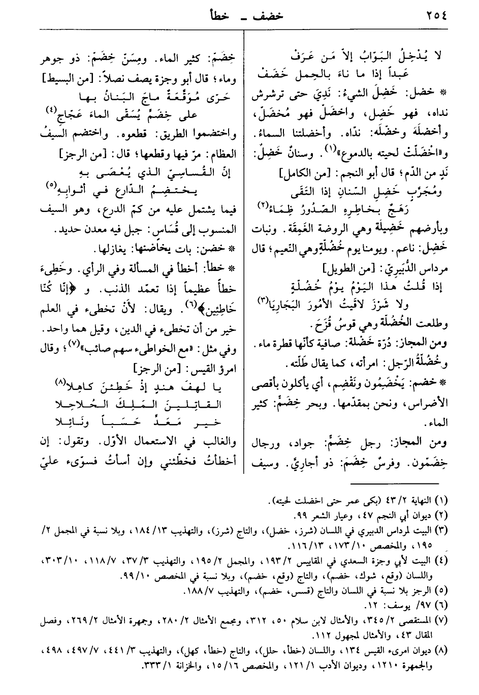 أخطأ في المسئلة وفي الرأي. وخطيء خطأ عظيماً إذا تعمد الذنب " وما كنا خاطئين " ويقال: لأن تخطيء في العلم خير من أن تخطيء في الدين، وقيل هما واحد. وفي مثل: " مع الخواطيء سهم صائب " وقال امرؤ القيس: