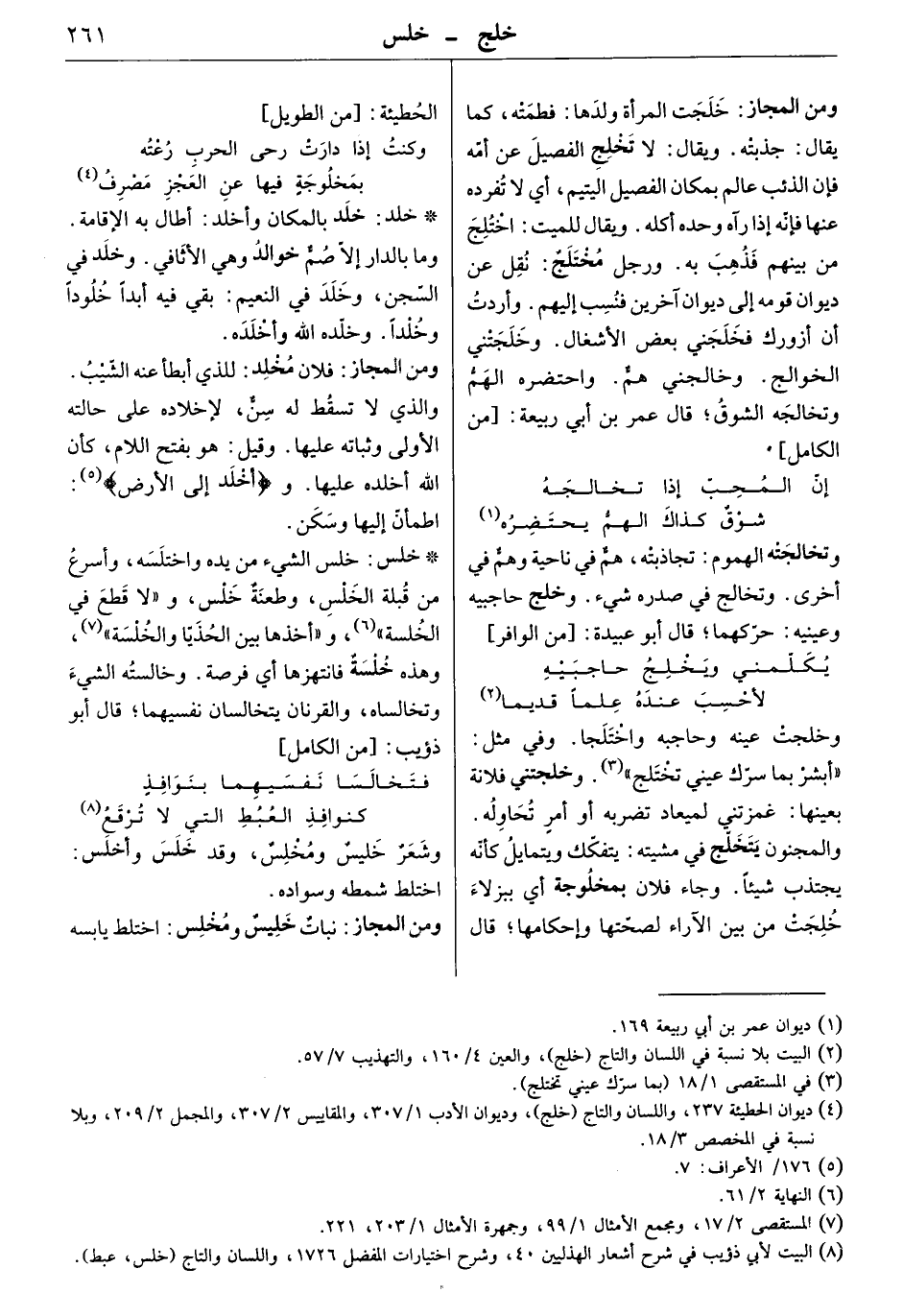وخلجت عينه وحاجبه واختلجا. وفي مثل: " أبشر بما سرك عيني تختلج " وخلجتني فلانة بعينها: غمزتني لميعاد تضربه أو أمر تحاوله. والمجنون يتخلج في مشيته: يتفكك ويتمايل، كأنه يجتذب شيئاً. وجاء فلان بمخلوجة أي ببزلاء خلجت من بين الآراء لصحتها وإحكامها. قال الحطيئة: