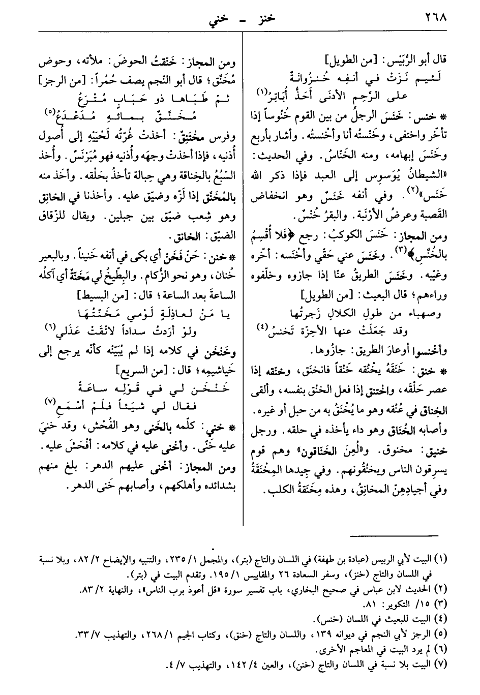 خنس الرجل من بين القوم خنوساً إذا تأخر واختفى، وخنّسته أنا وأخنسته. وأشار بأربع وخنس إبهامه، ومنه الخناس. وفي الحديث " الشيطان يوسوس إلى العبد فإذا ذكر الله خنس " وفي أنفه خنس وهو انخفاض القصبة وعرض الأرنبة. والبقر خنس.