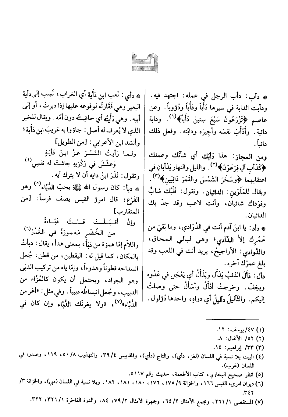 دأب الرجل في عمله: اجتهد فيه. ودأبت الدابة في سيرها دأباً ودأباً ودءوباً. وعن عاصم " تزرعون سبع سنين دأباً ". ودابة دائبة. وأدأب نفسه وأجيره ودابته. وفعل ذلك دائباً.