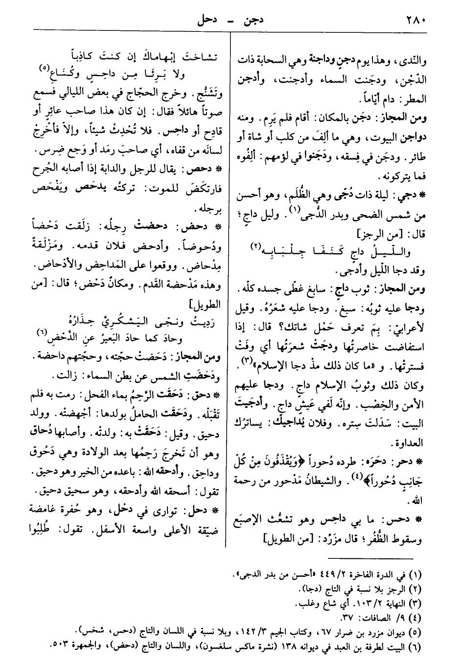 ومن المجاز: ثوب داج: سابغ غطى جسده كلّه. ودجا عليه ثوبه: سبغ. ودجا عليه شعره. وقيل لأعرابي: بم تعرف حمل شاتك. قال: إذا استفاضت خاصرتها ودجت شعرتها أي وفت فسترتها. وما كان ذلك مذ دجا الإسلام. وكان ذلك وثوب الإسلام داج. ودجا عليهم الأمن والخصب. وإنه لفي عيش داج. وأدجيت البيت: سدلت ستره. وفلان يداجيك: يساترك العداوة.