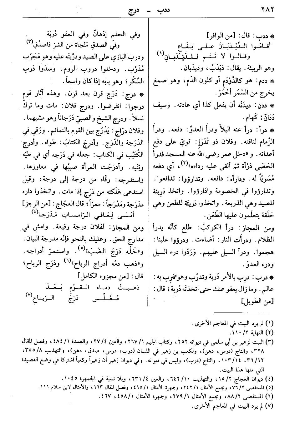 درج قرن بعد قرن. وهذه آثار قوم درجوا: انقرضوا. ودرج فلان: مات وما ترك نسلاً. ودرج الشيخ والصبيّ درجاناً وهو مشيهماً. وفلان درّاج: يدرج بين القوم بالنمائم. ورقي في الدرجة والدرج. وأدرج الكتاب: طواه. وأدرج الكتيّب في الكتاب: جعله في درجه أي في طيه وثنيه. وأدرجت المرأة صبيها في معاوزها. واستدرجه: رقّاه من درجة إلى درجة، وقيل استدعى هلكته من درج إذا مات. واتخذوا داره مدرجة ومدرجاً: ممتراً. قال العجاج: