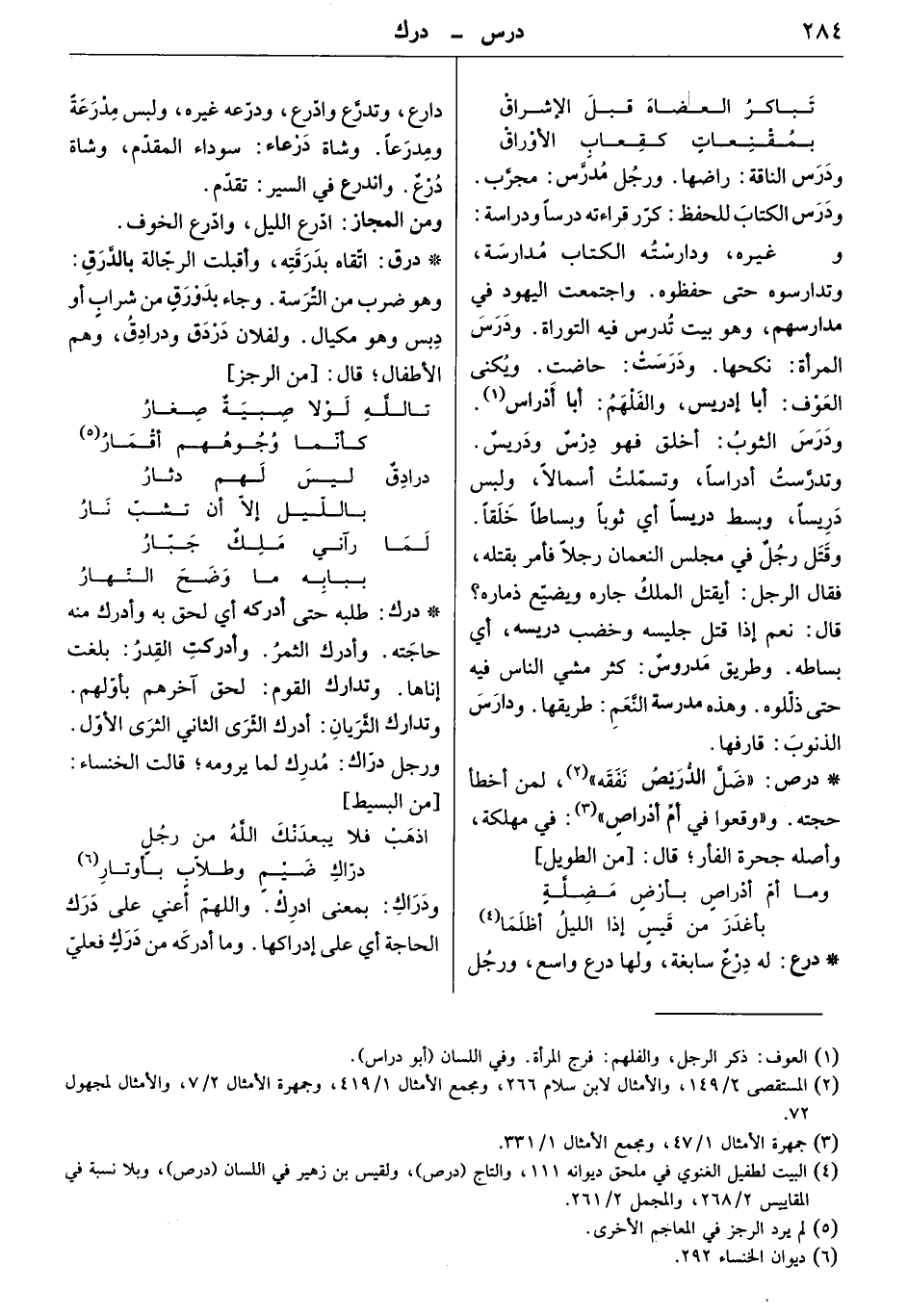 ودرس الناقة: راضها. ورجل مدرّس: مجرّب. ودرس الكتاب للحفظ: كرر قراءته درساً ودراسة، ودرس غيره، ودارسته الكتاب مدارسة، وتدارسوه حتى حفظوه. واجتمعت اليهود في مدراسهم، وهو بيت تدرس فيه التوراة. ودرس المرأة: نكحها. ودرست: حاضت. ويكنى العوف: أبا إدريس، والفلهم: أبا أدراس. ودرس الثوب: أخلق فهو درس ودريس. وتدرّست أدراساً، وتسمّلت أسمالاً، ولبس دريساً، وبسط دريساً أي ثوباً وبساطاً خلقاً. وقتل رجل في مجلس النعمان رجلاً فأمر بقتله، فقال الرجل: أيقتل الملك جاره، ويضيّع ذماره؛ قال: نعم إذا قتل جليسه، وخضب دريسه؛ أي بساطه. وطريق مدروس: كثر مشي الناس فيه حتى ذلّلوه. وهذه مدرسة النعم: طريقها. ودارس الذنوب: قارفها.