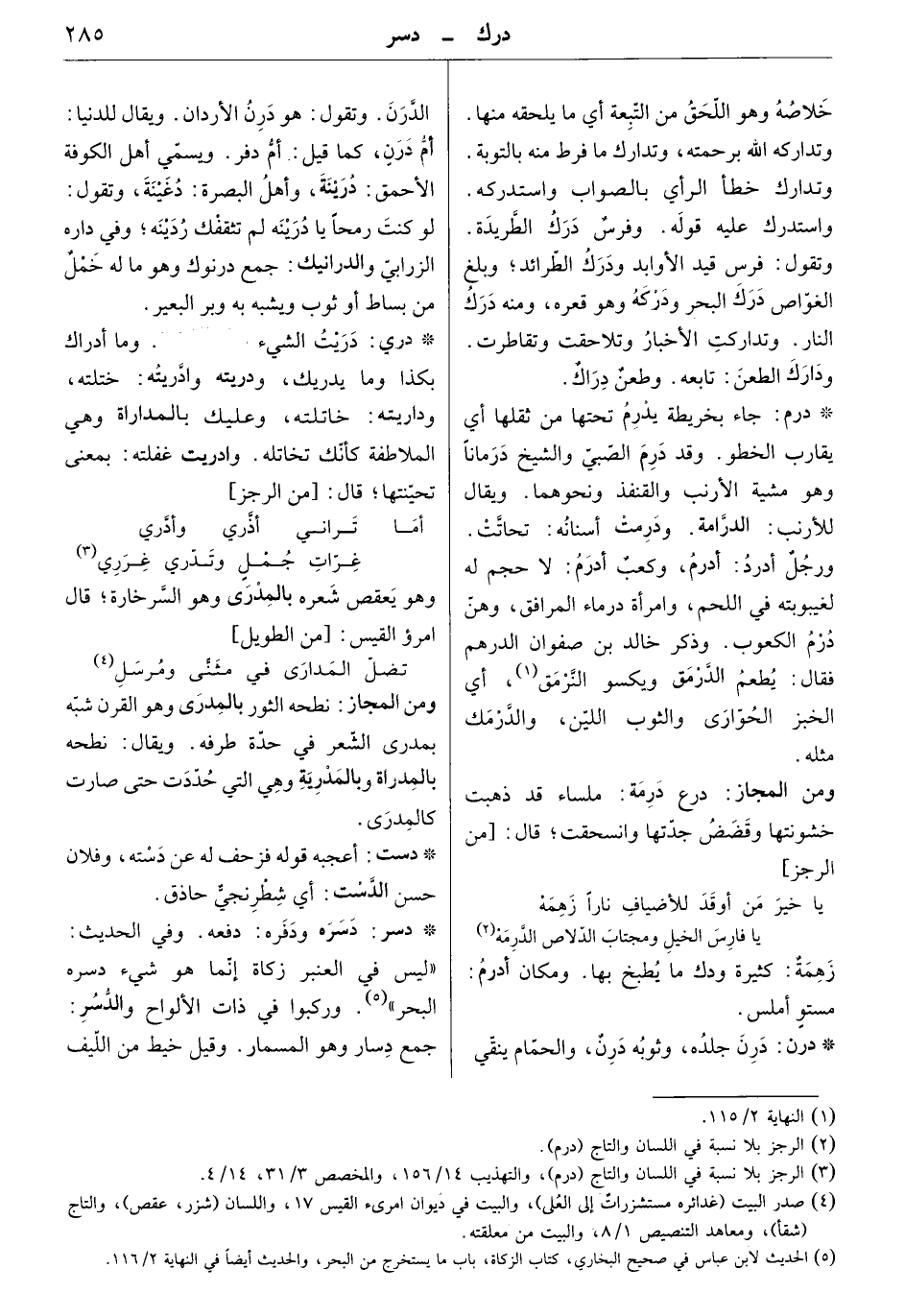 خلاصه وهو اللحق من التبعة أي ما يلحقه منها. وتداركه الله برحته، وتدارك ما فرط منه بالتوبة. وتدارك خطأ الرأي بالصواب واستدركه. واستدرك عليه قوله. وفرس درك الطريدة. وتقول: فرس قيد الأوابد، ودرك الطرائد؛ وبلغ الغوّاص درك البحر وهو قعره، ونه درك النار. وتداركت الأخبار وتلاحقت وتقاطرت. ودارك الطعن: تابعه. وطعن دراك.