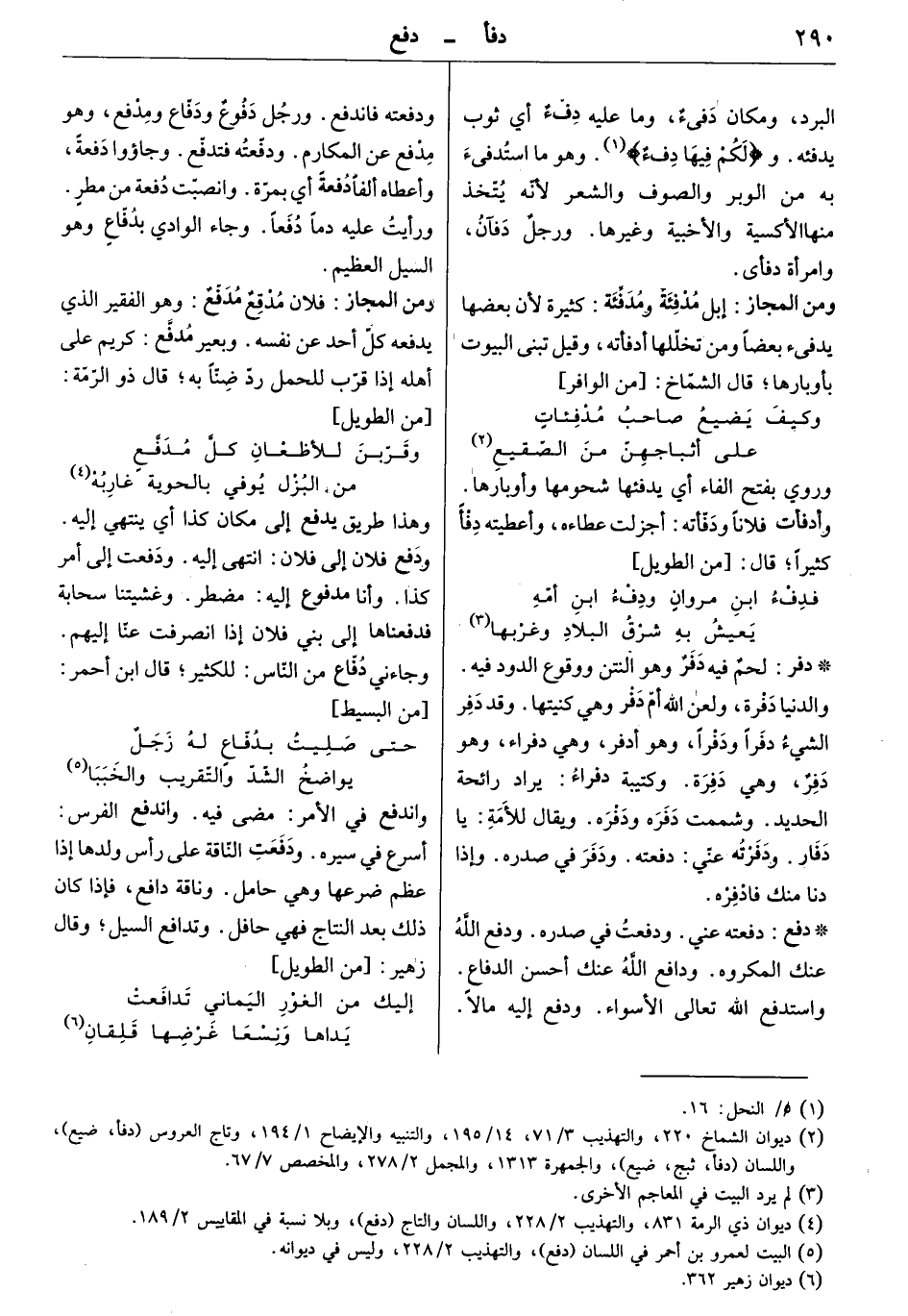 البرد، ومكان دفيء، وما عليه دفء أي ثوب يدفئه و" لكم فيها دفء " وهو ما استدفيء به من الوبر والصوف والشعر لأنه يتخذ منها الأكسية والأخبية وغيرها. ورجل دفآن، وامرأة دفأى. ومن المجاز: إبل مدفئة ومدفّئة: كثيرة لأن بعضها يدفيء بعضاً ومن تخللها أدفأته وقيل تبنى البيوت بأوبارها. قال الشماخ: