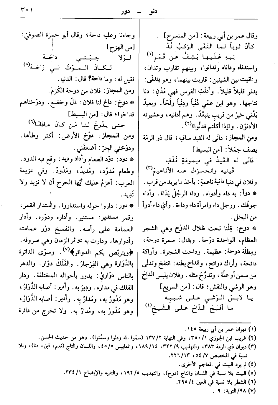 داروا حوله واستداروا. واستدار القمر، وقمر مستدير: مستير. وأداره ودوّره. وأدار العمامة على رأسه. وانفسخ دور عمامته وأدوارها. ودارت به دوائر الزمان وهي صروفه. ويتربص بكم الدوائر. وسوّى الدائرة بالدّوارة وهي الفرجار. والفلك دوّار. والدهر بالناس دوّاريٌّ: يدور بأحواله المختلفة. ودار الفلك في مداره. ودير به. وأدير أصابه الدوار، وهو مدور به، ومدار به. ولا تخرج من دائرة