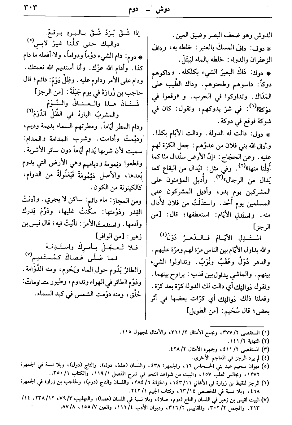 ودام المطرأياماً. ومطرتهم السماء بديمة وديم، وديمت وأدامت. وشرب المدامة والمدام: سميت لأن شربها يدام أياماً دون سائر الأشربة. وقطعوا ديمومة ودياميم وهي الأرض التي يدوم بعدها، والأصل ديمومة فيعلولة من الدوام، كالكينونة من الكون.