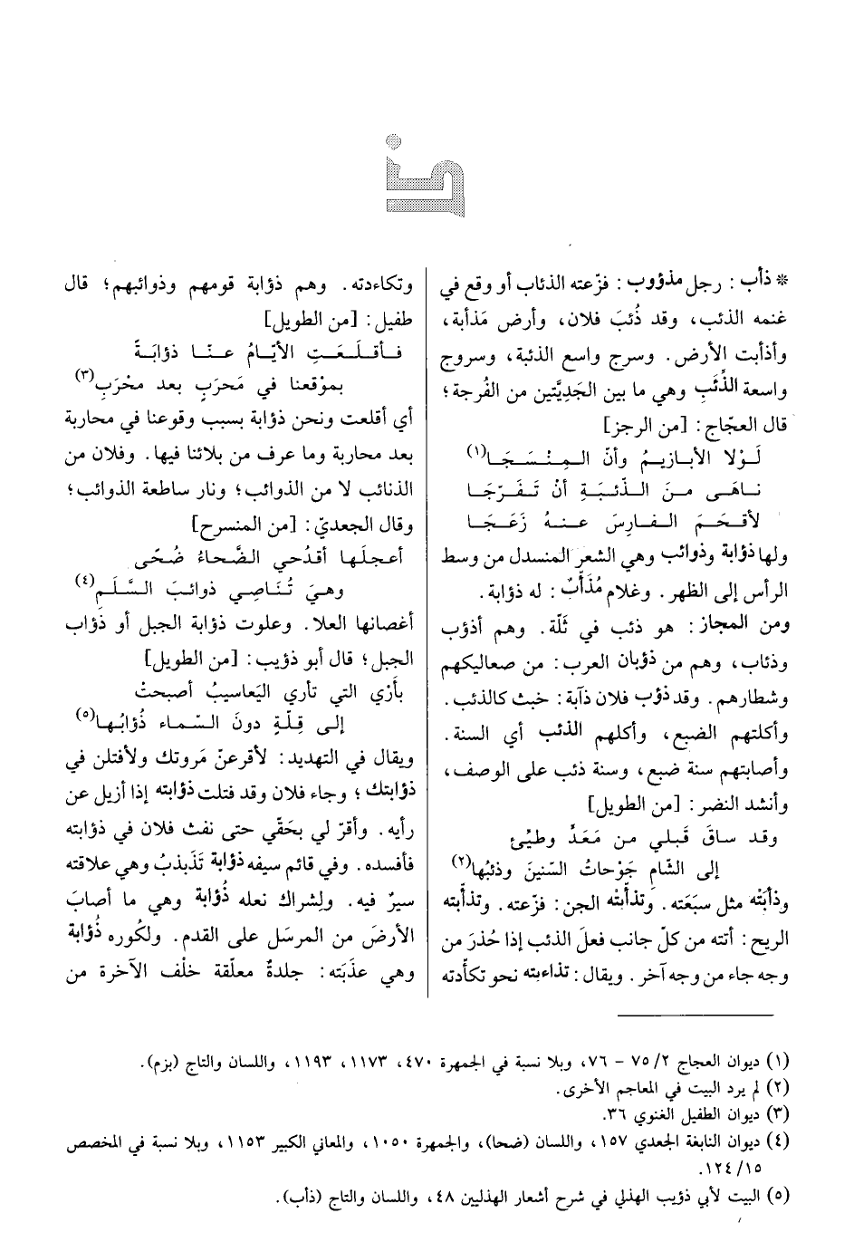 رجل مذءوب: فزعته الذئاب أو وقع في غنمه الذئب، وقد ذئب فلان، وارض مذأبة، وأدأبت الأرض. وسرج واسع الذئبة، وسروج واسعة الذئب وهي ما بين الجديتين من الفرجة. قال العجاج: