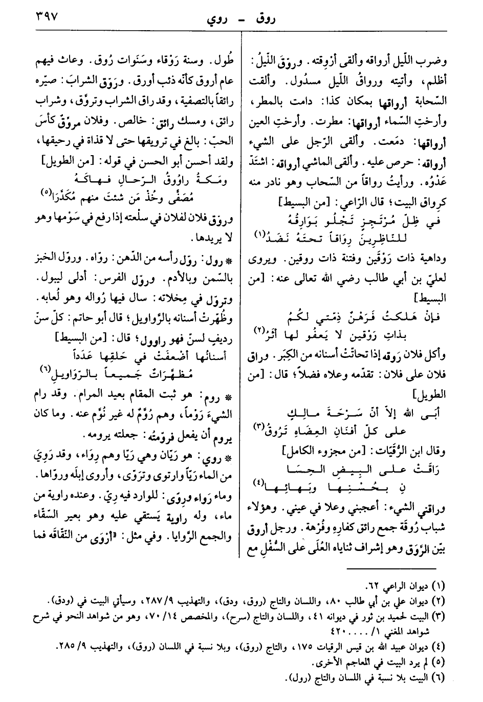 وضرب الليل أرواقه وألقى أروقته. وروق الليل: أظلم، وأتيته ورواق الليل مسدول. وألقت السحابة أرواقها بمكان كذا: دامت بالمطر، وأخرت السماء أرواقها: مطرت. وأرخت العين أرواقها: دمعت. وألقى الرجل على الشيء أروافه: حرص عليه. وألقى الماشي أرواقه: اشتد عدوه. ورأيت رواقاً من السحاب وهو نادر منه كرواق البهت. قال الراعي: