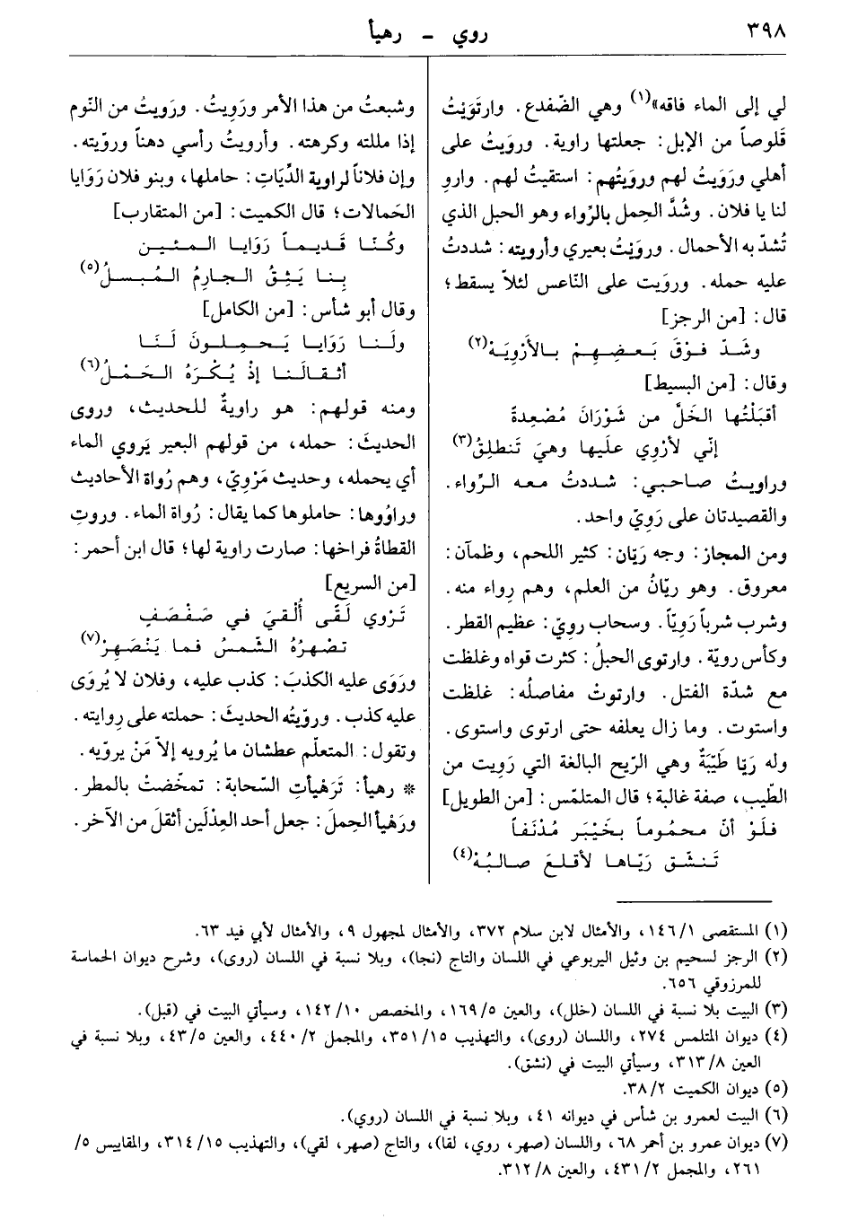 وشبعت من هذا الأمر ورويت. ورويت من النوم إذا مللته وكرهته. وأرويت رأسي دهناً وروّيته. وإن فلاناً لراوية الديات: حاملها، وينو فلان روايا الحمالات. قال الكميت: