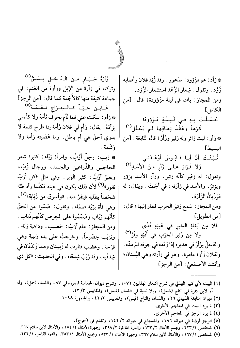 رجل أزب، وامرأة زباء: كثيرة شعر الحاجبين والذراعين والجسد، ورجال زب، وبعير أزب: كثير الوبر. وفي مل " كل أزب نفور " لأن ذلك يكون في عينه فكلما رآه ظنه شخصاً يطلبه فينفر منه. " وأسرق من زبابة " وهي فأرة برية صماء. وتقول: صموا عن الحق كأنهم زباب، وصمموا على الحرص كأنهم ذباب.
