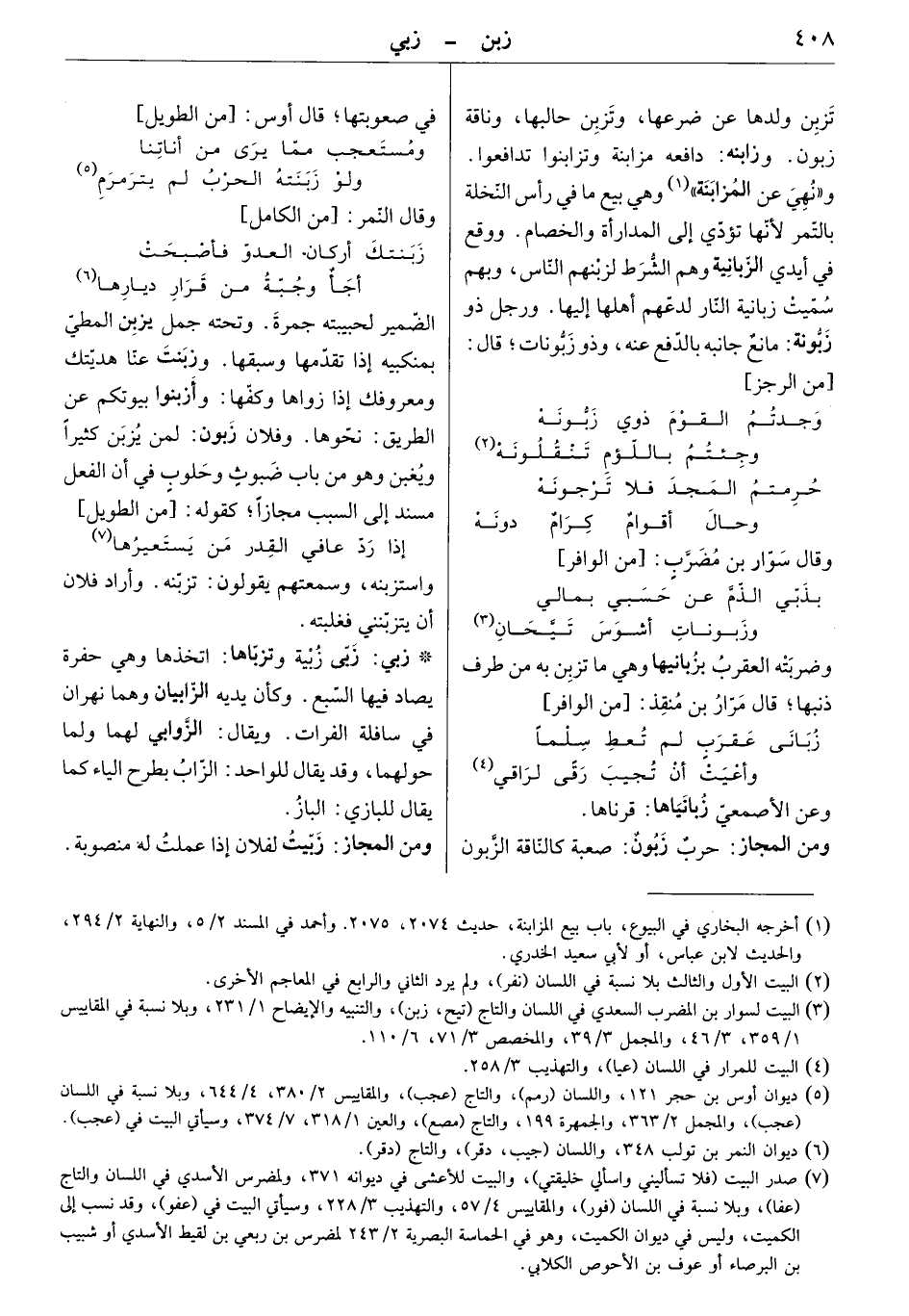 الضمير لحبيبته جمرة. وتحته جمل يزبن المطي بمنكبيه إذا تقدمها وسبقها. وزبنت عنا هديتك ومعروفك إذا زواها وكفها. وأزبنوا بيوتكم عن الطريق: نحوها. وفلان زبون: لمن يزبن كثيراً ويغبن وهو من باب ضبوث وحلوب في أن الفعل مسند إلى السبب مجازاً. كقوله:
