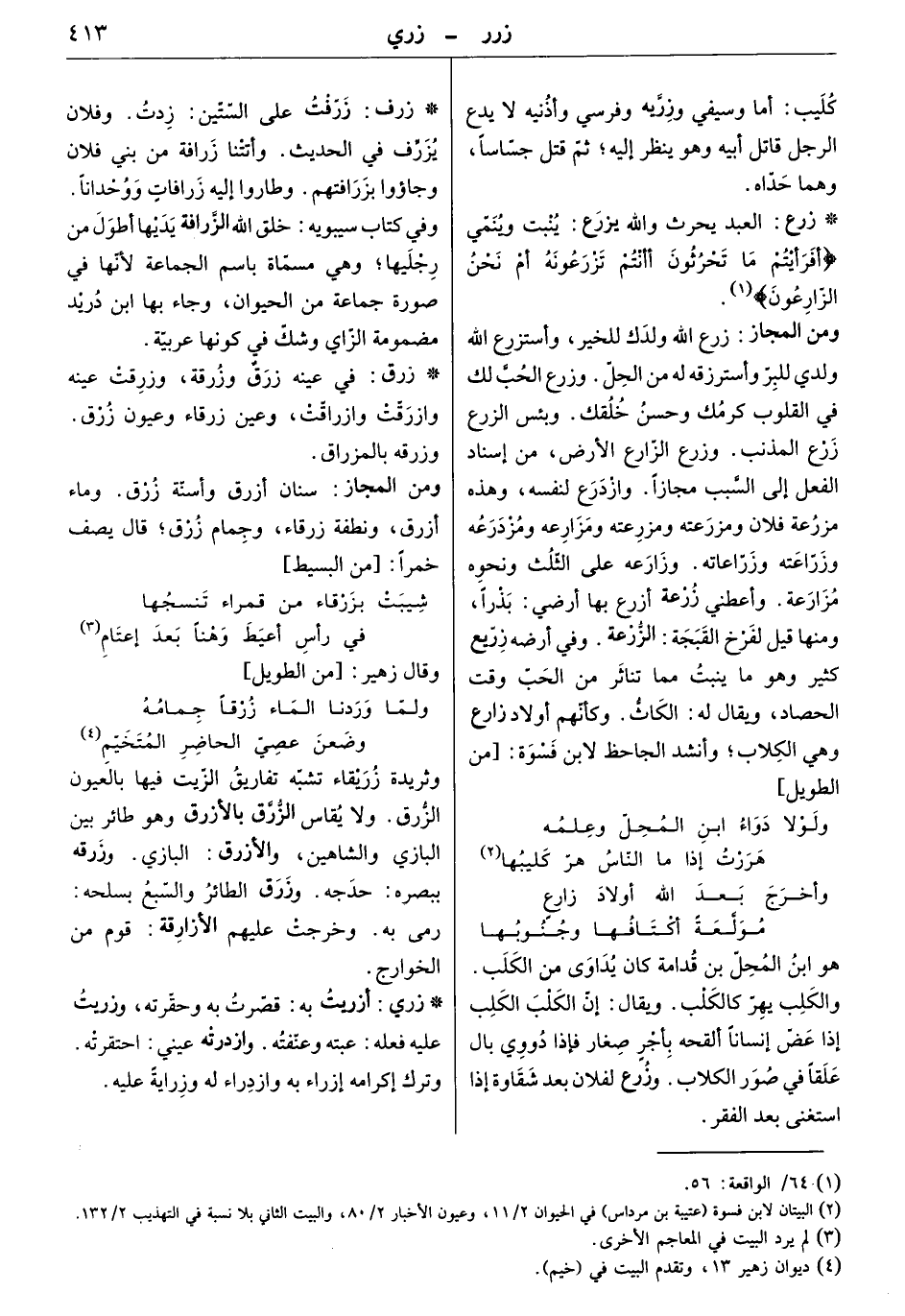 ومن المجاز: زرع الله ولدك للخير، وأستزرع الله ولدي للبر وأسترزقه له من الحل. وزرع الحب لك في القلوب كرمك وحسن خلقك. وبئس الزرع زرع المذنب. وزرع الزارع الأرض من إسناد الفعل إلى السبب مجازاً. وازدرع لنفسه: وهذه مزرعة فلان ومزارعه ومزدرعه وزراعته وزراعتاته. وزارعه على الثل ونحوه مزارعة. وأعطني زرعة أزرع بها أرضي بذراً ومنها قيل لفرخ القبجة: الزرعة. وفي أرضه زريع كثير وهو ما ينبت مما تناثر من الحب وقت الحصاد، ويقال له: الكاث. وكأنهم أولاد زارع وهي الكلاب. وأنشد الجاحظ لابن فسوة: