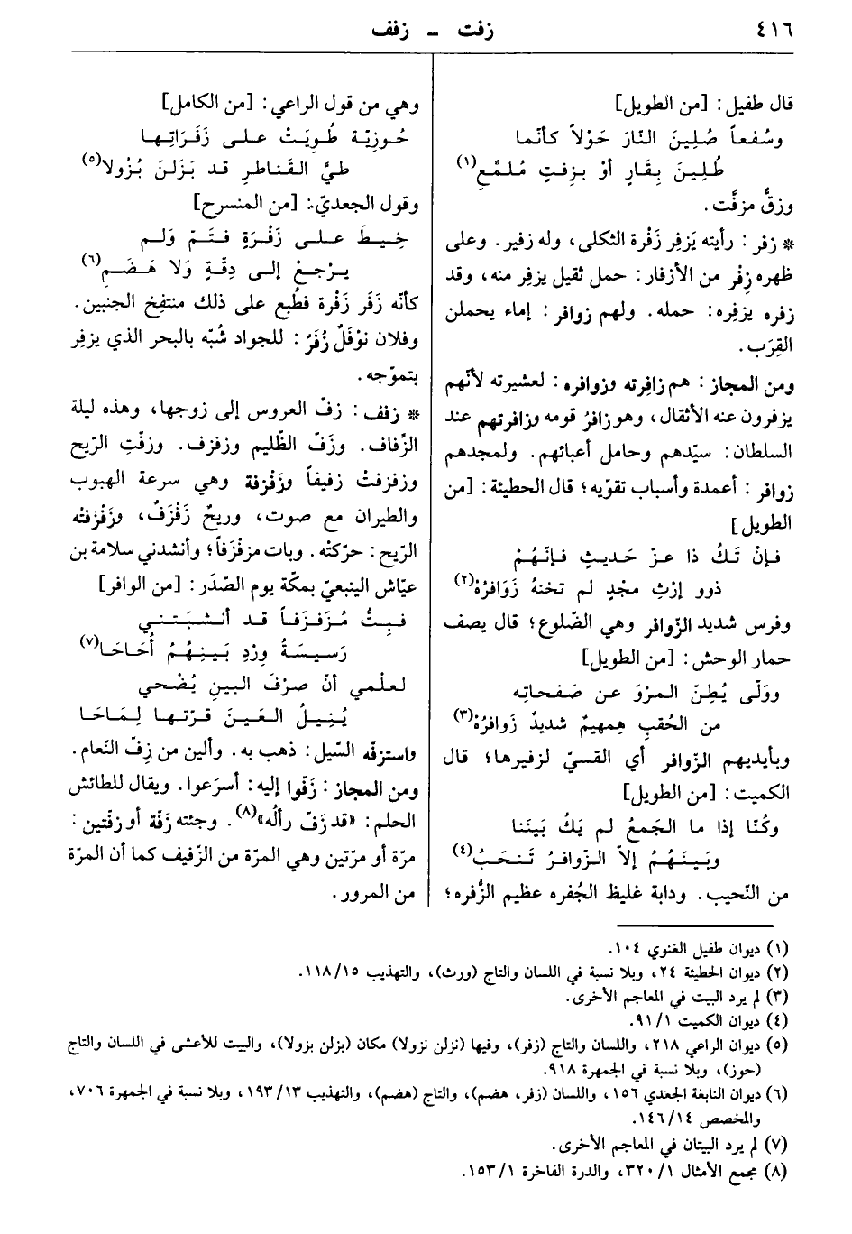 ومن المجاز: هم زافرته وزوافره: لعشيرته لأنهم يزفرون عنه الأثقال، وهو زافر قومه وزافرتهم عند السلطان: سيدهم وحامل أعبائهم. ولمجدهم زوافر: أعمدة وأسباب تقويه. قال الحطيئة: