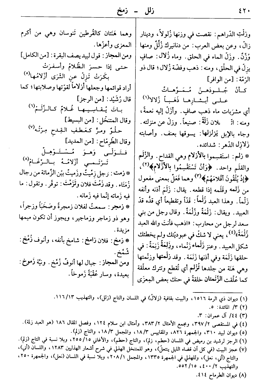 أي مشربات ماء ذهب صاف. وأزل إليه نعمة، ومنه: اتخذ فلان زلة: صنيعاً. وزل عن منزلته. وجاء بالإبل يزلزلها: يسوقها بعنف. وأصابته زلازل الدهر: شدائده.