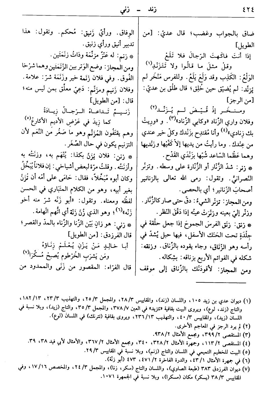 ومن المجاز: لأقودنك، بالزناق، إلى موقف الوفاق. ورأى زنيق: محكم. وتقول: هذا تدبير أنيق، ورأي زنيق.