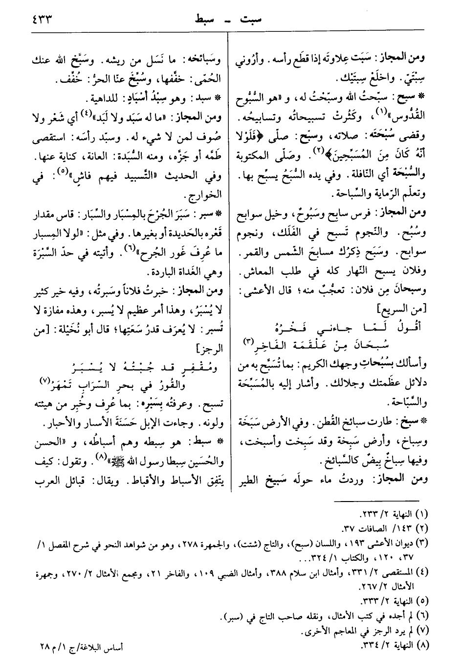 ومن المجاز: فرس سابح وسبوح، وخيل سوابح وسبح. والنجوم تسبح في الفلك، ونجوم سوابح وسبح. والنجوم تسبح في الفلك، ونجوم سوابح. وسبح ذكرك مسابح الشمس والقمر. وفلان يسبح النهار كله في طلب المعاش. وسبحان من فلان: تعجب منه. قال الأعشى: