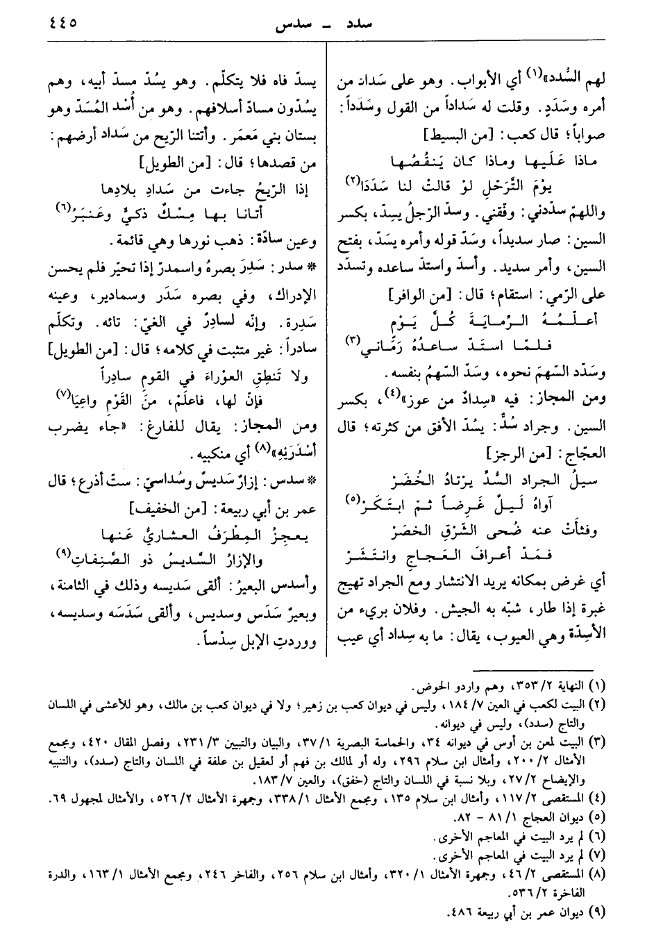 أي غرض بمكانه يريد الانتشار ومع الجراد تهيج غبرة إذا طار، شبه به الجيش. وفلان بريء من الأسدة وهي العيوب، يقال: ما به سداد أي عيب يسد فاه فلا يتكلم. وهو يسد مسد أبيه، وهم يسدون مساد أسلافهم. وهو من أسد المسد وهو بستان بني معمر. وأتتنا الريح من سداد أرضهم: من قصدها. قال: