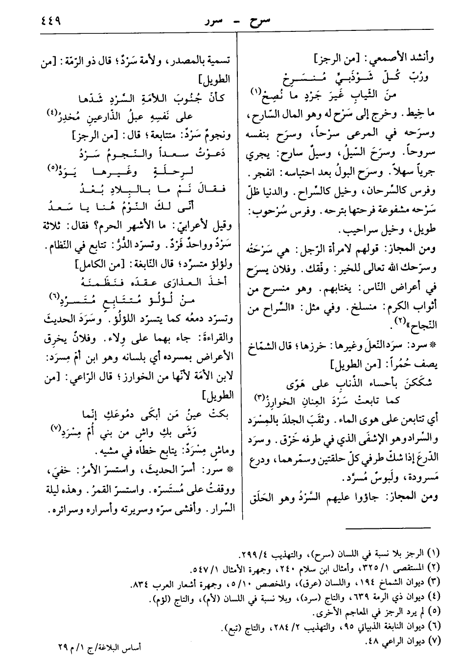 وتسرد دمعه كما يتسرد اللؤلؤ. وسرد الحديث والقراءة: جاء بهما على ولاء. وفلان يخرق الأرعاض بمسرده أي بلسانه. وهو ابن أمّ مسرد: لابن الأمة لأنها من الخوارز. قال الراعي: