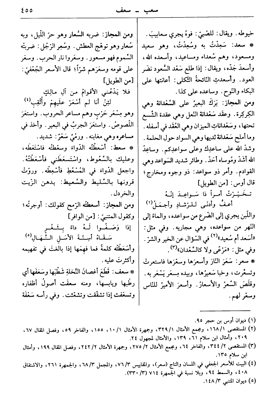 واللبن يجري إلى الضرع من سواعده، والماء إلى النهر من سواعده وهي مجاريه. وفي مثل " أسعد أم سعيد " في السؤال عن الخير والشر. وفي مثل: " مرعًى ولا كالسعدان ".
