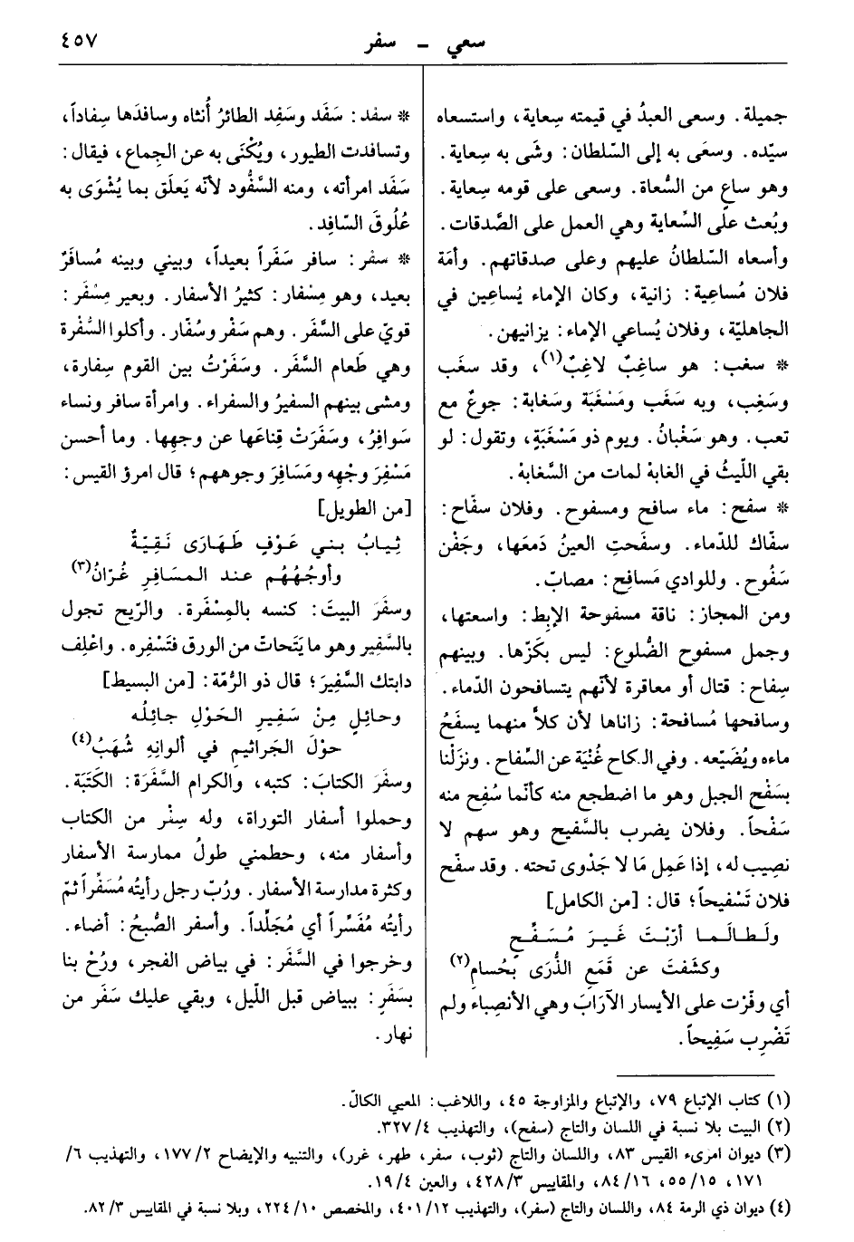 سافر سفراً بعيداً، وبيني وبينه مسافر بعيد، وهو مسفار: كثير الأسفار. وبعير مسفر: قويّ على السفر. وهم سفر وسفار. وأكلوا السفرة وهي طعام السفر. وسفرت بين القوم سفارة، ومشى بينهم السفير والسفراء. وامرأة سافر، ونساء سوافر، وسفرت قناعها عن وجهها. وما أحسن مسفر وجهه ومسافر وجوههم. قال امرؤ القيس: