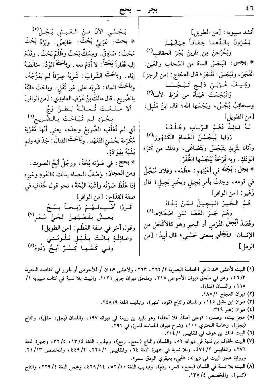 بجله في أعينهم: عظمه، وفلان مبجل في قومه، وجئت بأمر بجيل، وبخير بجيل. قال زهير: