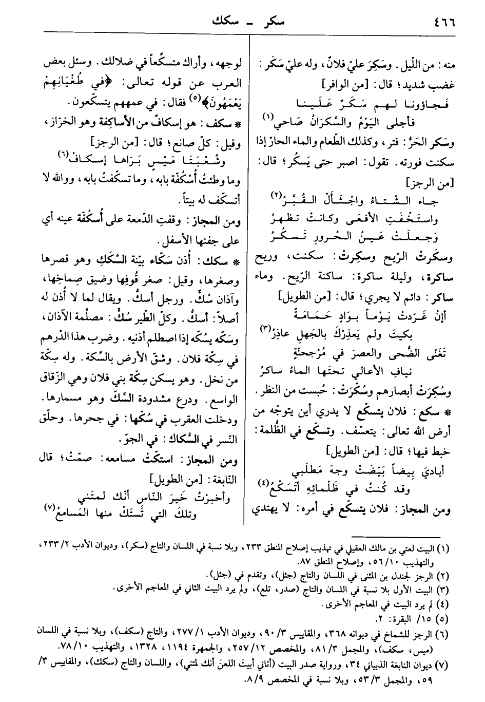 إذن سكاء بيّنة السكك وهو قصرها وصغرها، وقيل: صغر قوفها وضيق صماخها، وآذان سك. ورجل أسك. ويقال لما لا أذن له أصلاً: أسك. وكل الطير سك: مصلمة الآذان، وسكه يسكه إذا اصطلم أذنيه. وضرب هذا الدرهم في سكة فلان. وشق الأرض بالسكة. وله سكة من نخل. وهو يسكن سكة بني فلان وهي الزقاق الواسع. ودرع مشدودة السك وهو مسمارها. ودخلت العقرب في سكها: في جحرها. وحلق النسر في السكاك: في الجو.